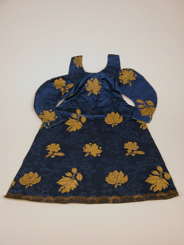 Blauwe jurk met ingeweven bloemen en met goudgele bloemen en bladeren, afgezet met goudgalon, voor staakmadonna