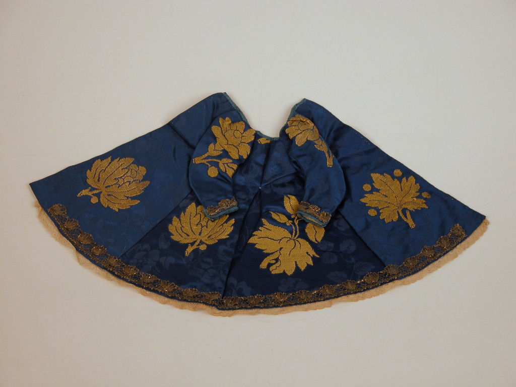 Blauw kleed met ingeweven bloemen en met goudgele bloemen en bladeren, afgezet met goudgalon en kantrandje, voor Christuskind van staakmadonna