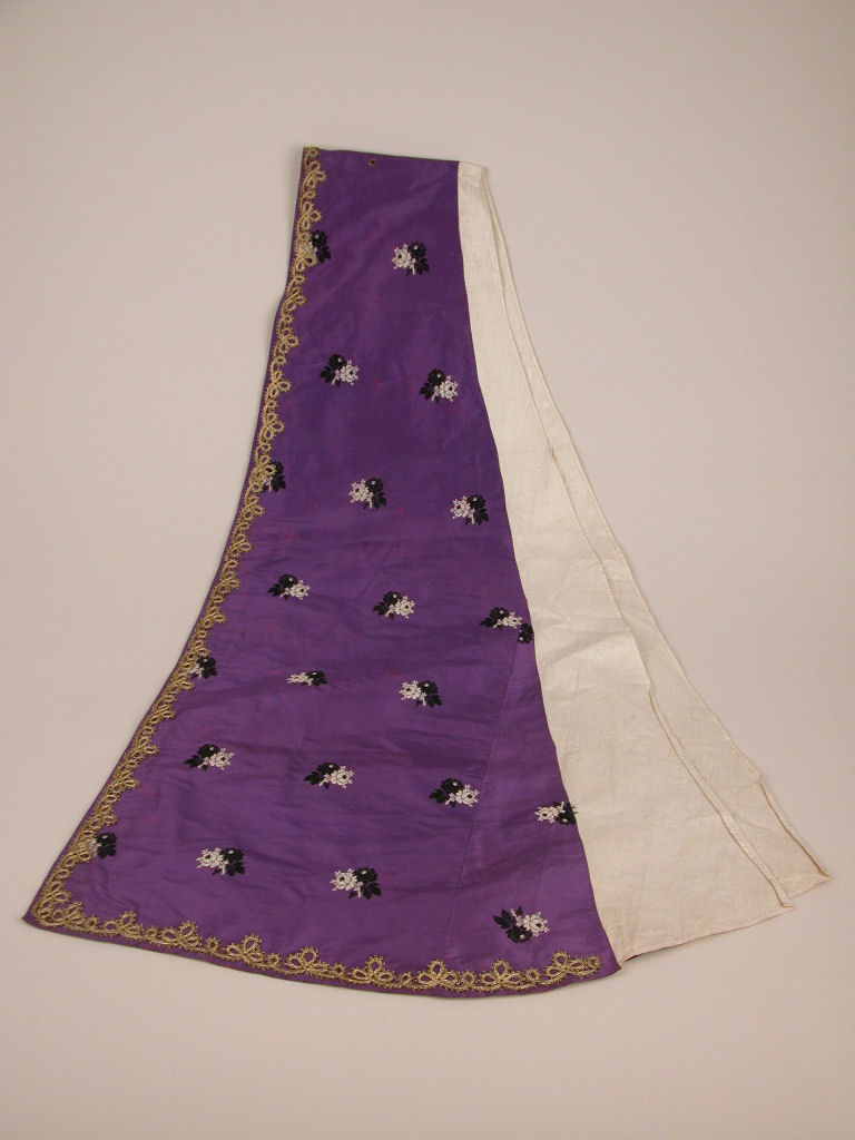 Paarse hoofddoek met witte en zwarte bloemen, afgezet met goudgalon, voor staakmadonna