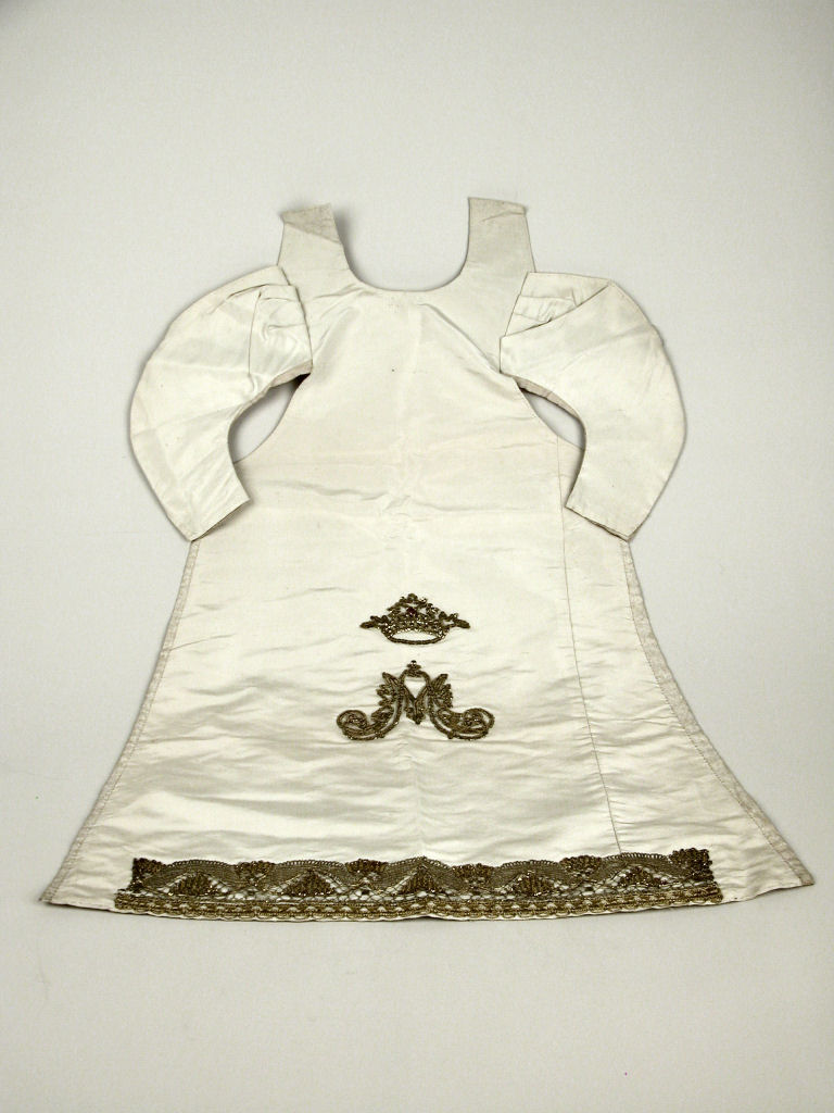 Witte jurk met Mariamonogram en kroon in pailetten, met brede rand goudgalon, voor staakmadonna