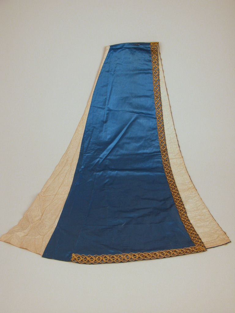 Blauwe hoofddoek afgezet met goudgalon, voor staakmadonna