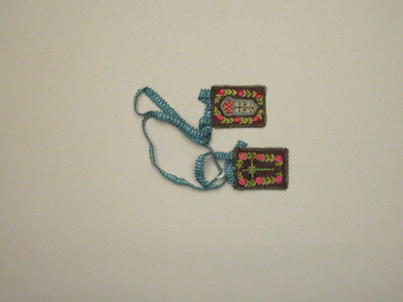 Bruine scapulier met schild waarop kruis en drie sterren en met kruis, voor staakmadonna