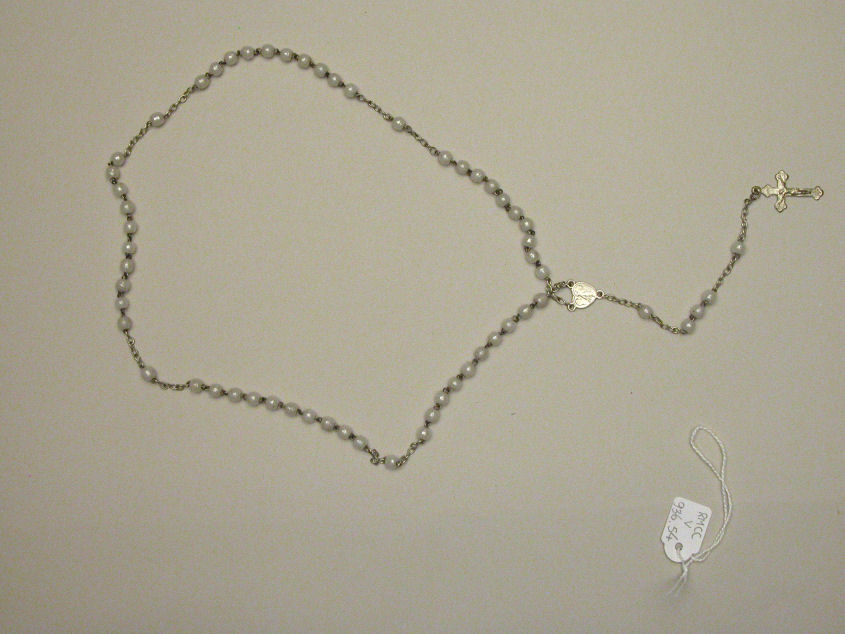 Rozenkrans met witte kralen en kruisbeeldje, voor staakmadonna