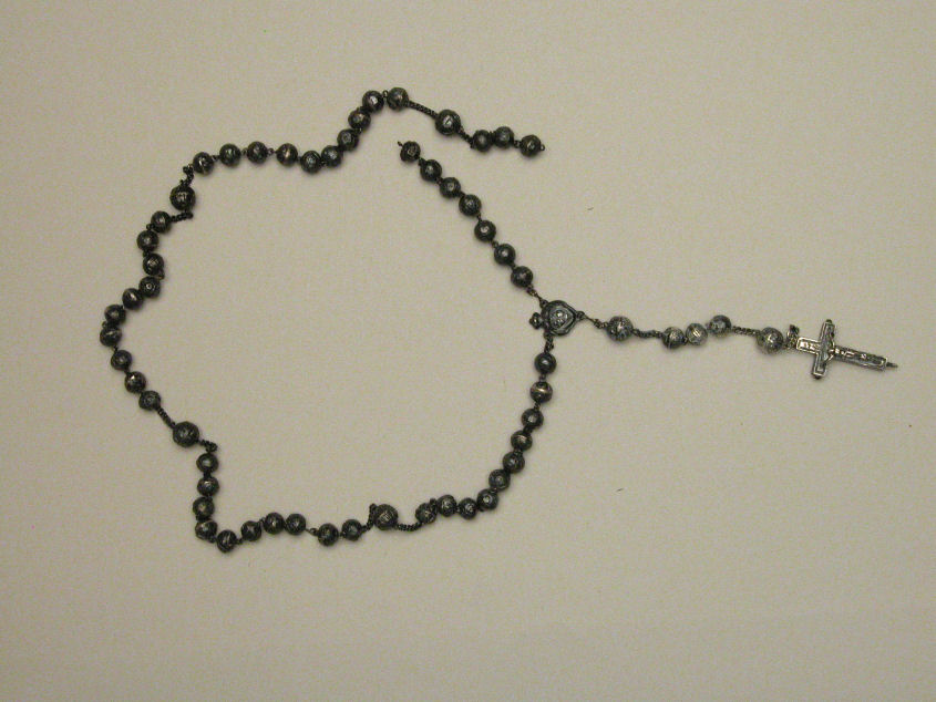 Rozenkrans met zilveren kralen en scharnierend kruisbeeldje, voor staakmadonna