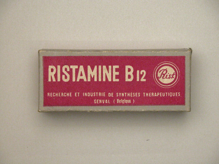 Medicijndoosje met spelden met "Ristamine B12 ..." op deksel, voor staakmadonna