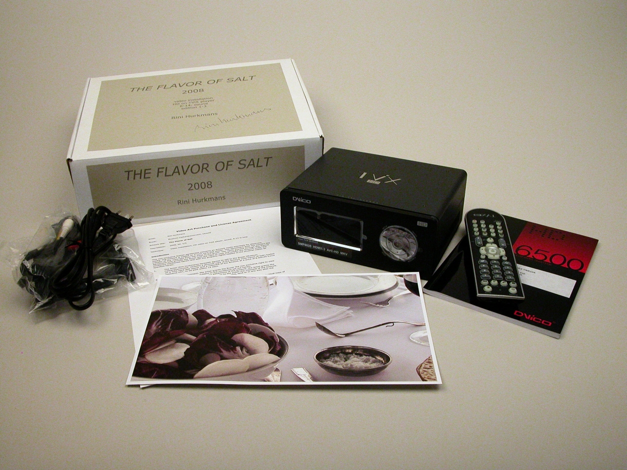 Het pakket met de film The flavor of salt bestaat uit een hd mpeg-video geïnstalleerd op een TViX-speler met handleiding, een purchase and license agreement en een video-still, samen in een witte kartonnen doos met opdruk en signatuur van de kunstenares. Op de TViX-speler staat alleen een loop-versie van de film van 2 uur en ...