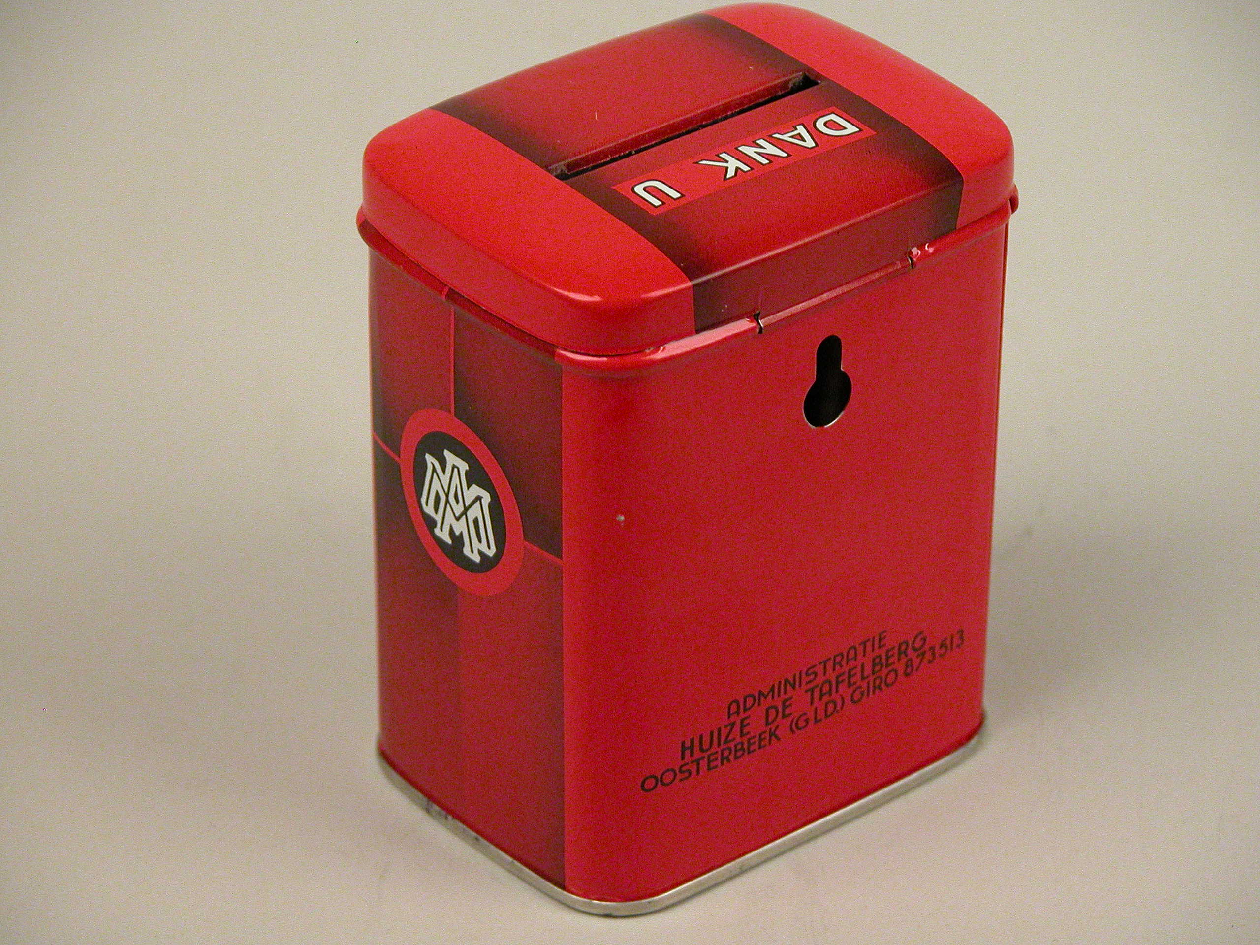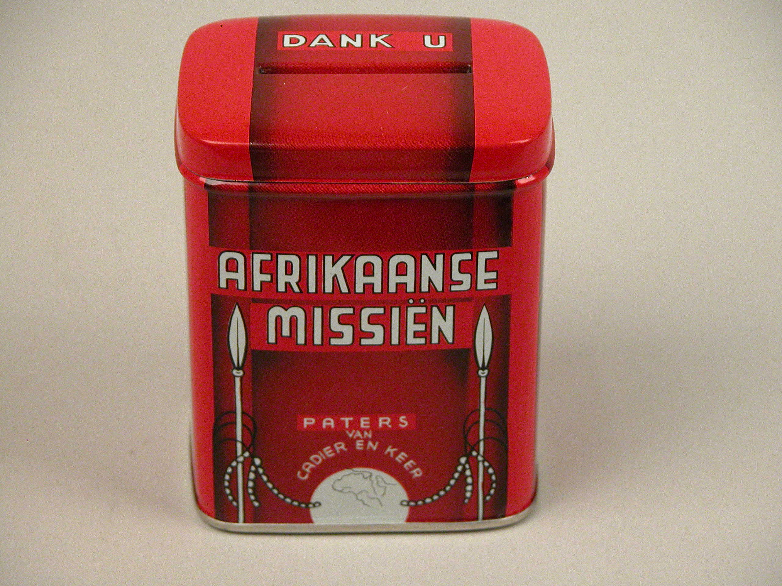 Rood missiebusje met twee speren en wereldbol, met "Afrikaanse missiën paters van Cadier en Keer"