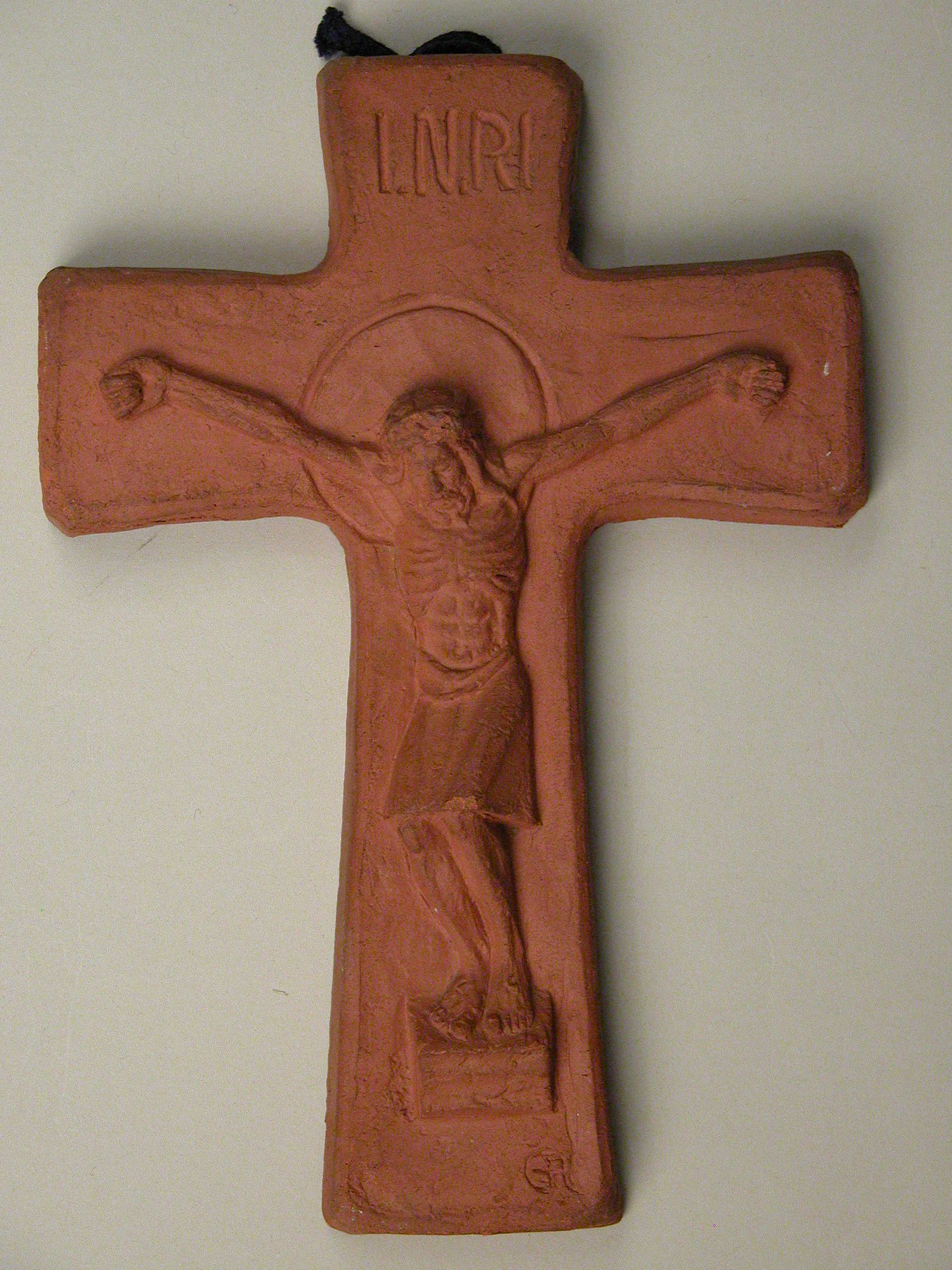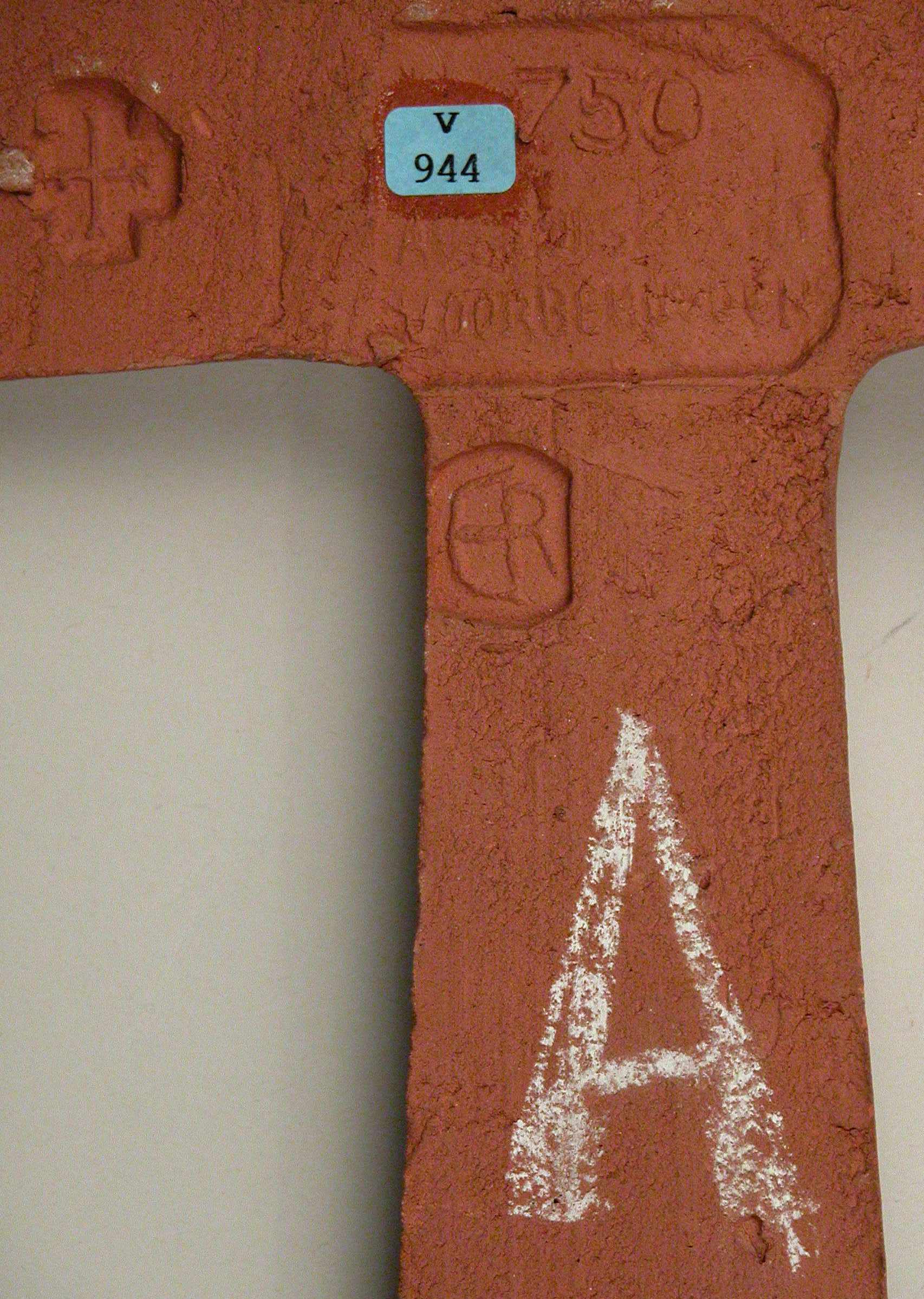 Kruisbeeld in reliëf. Aan de voorzijde het monogram "ER". Aan de achterzijde stempel met monogram "ER", drie stempels met kruisen, stempel met "750 auteursrecht voorbehouden" en letter "A" in witte verf.