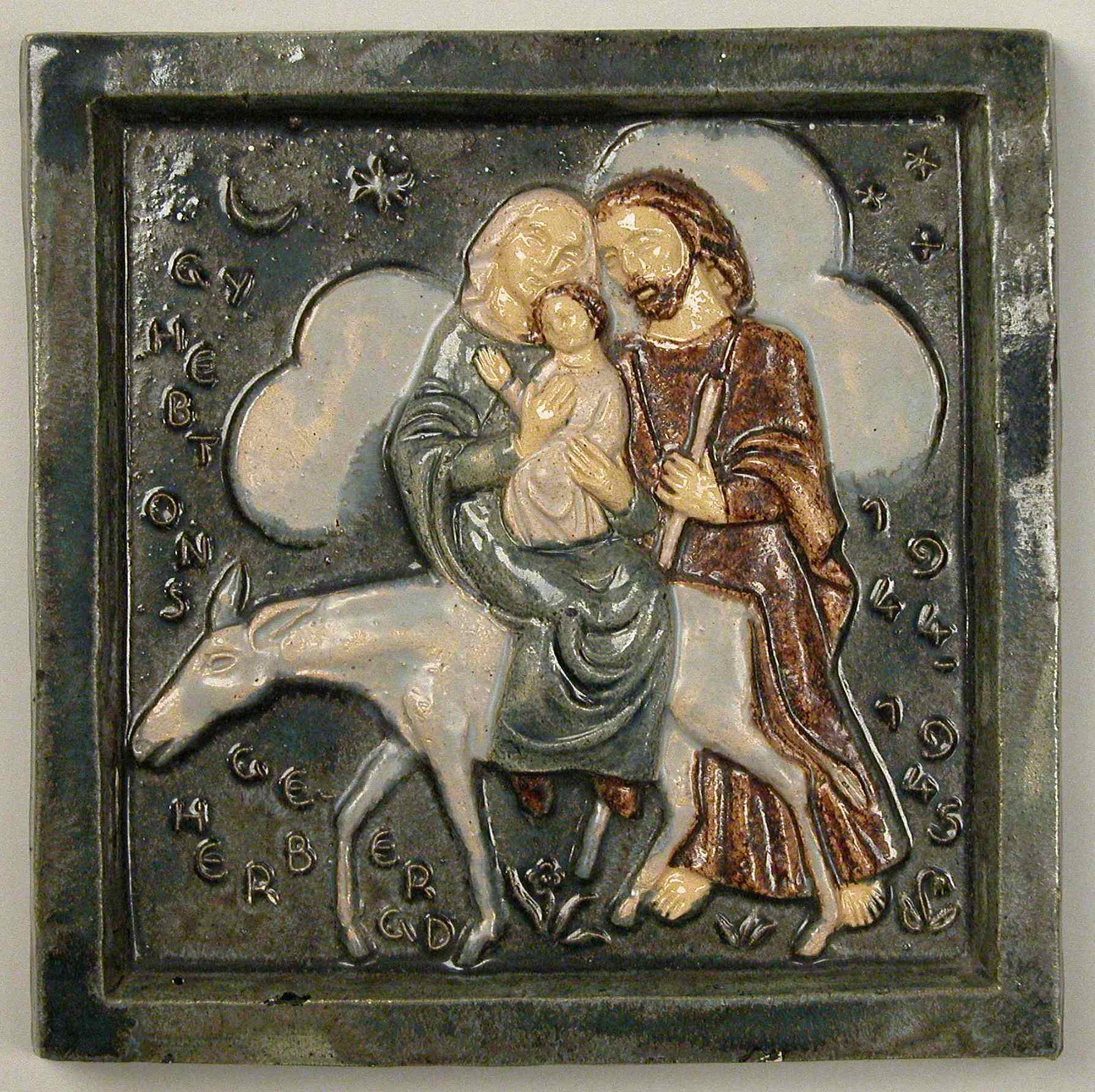Tegel met vlucht naar Egypte, Maria met kind op ezel en Jozef, met "Gij hebt ons geherbergd 1944-1945"
