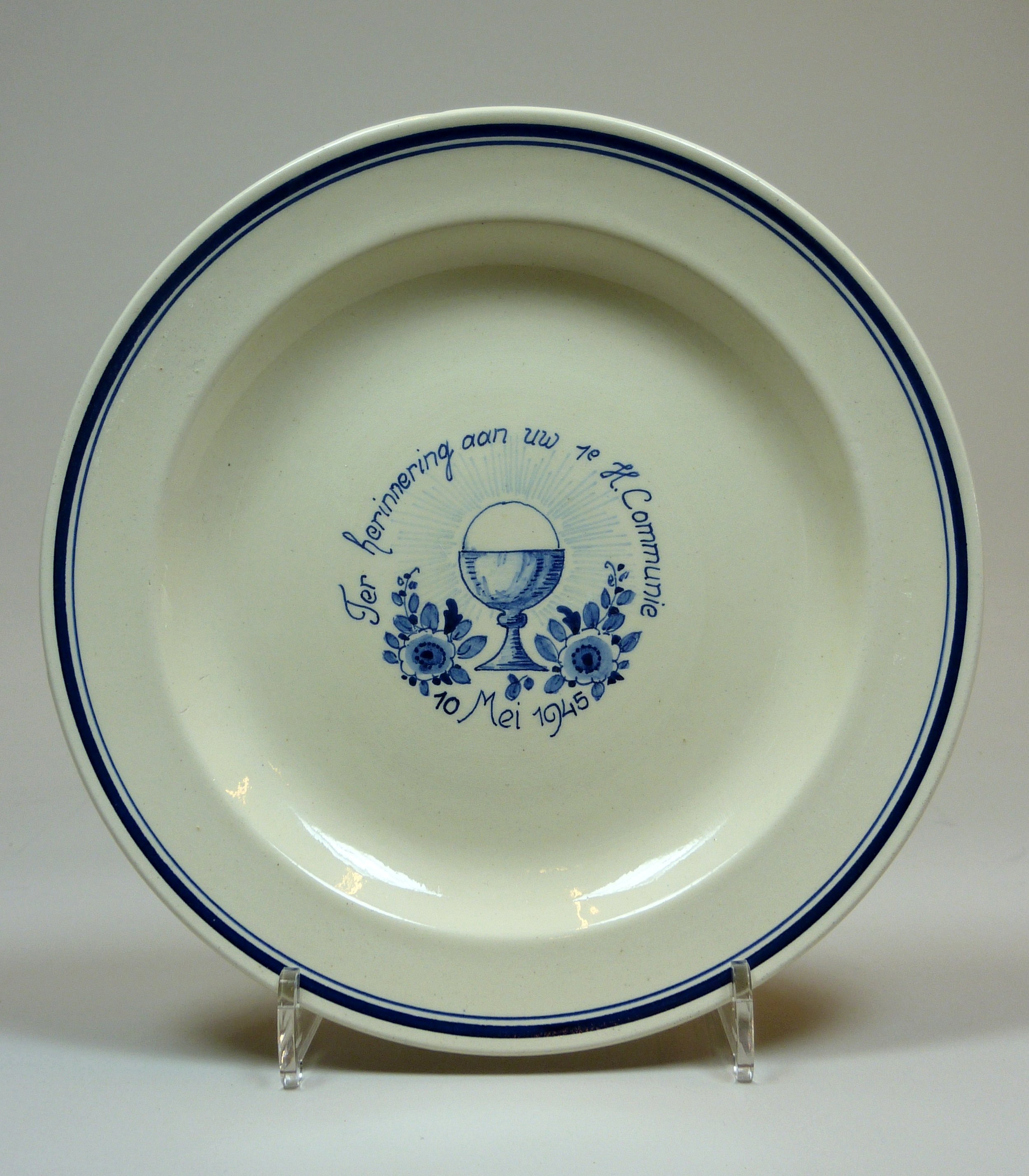 Bord behorend bij dejeunertje Eerste Heilige Communie met kelk en hostie tussen twee bloemen en met "Ter herinnering aan uw 1e H. Communie 10 Mei 1945"