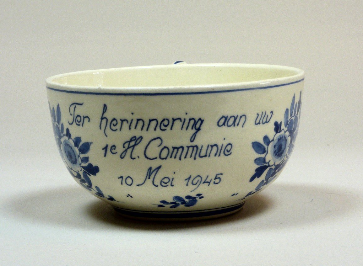 Kop behorend bij dejeunertje Eerste Heilige Communie met bloemendecor en met "Ter herinnering aan uw 1e H. Communie 10 Mei 1945"