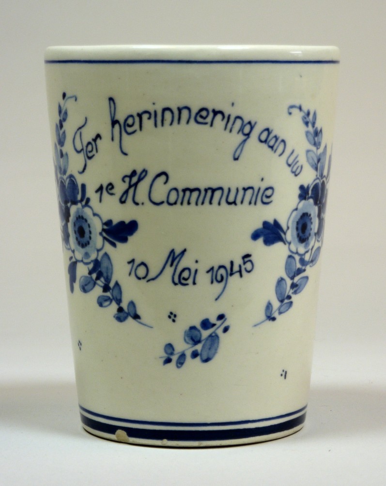 Melkbeker behorend bij dejeunertje Eerste Heilige Communie met bloemendecor en met "Ter herinnering aan uw 1e H. Communie 10 Mei 1945"