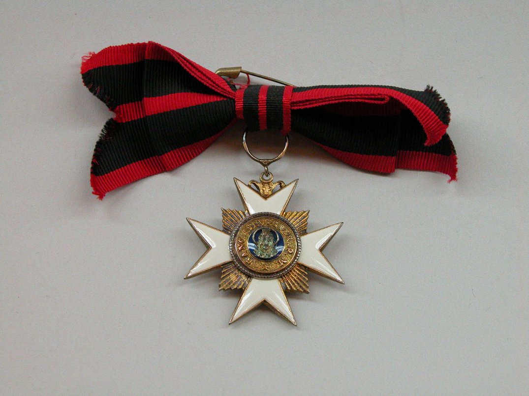 Onderscheiding damesorde Ridder St. Silvester, wit kruis met stralenkrans en beeltenis van St. Silvester op blauw email aan zwart met rood ordelint