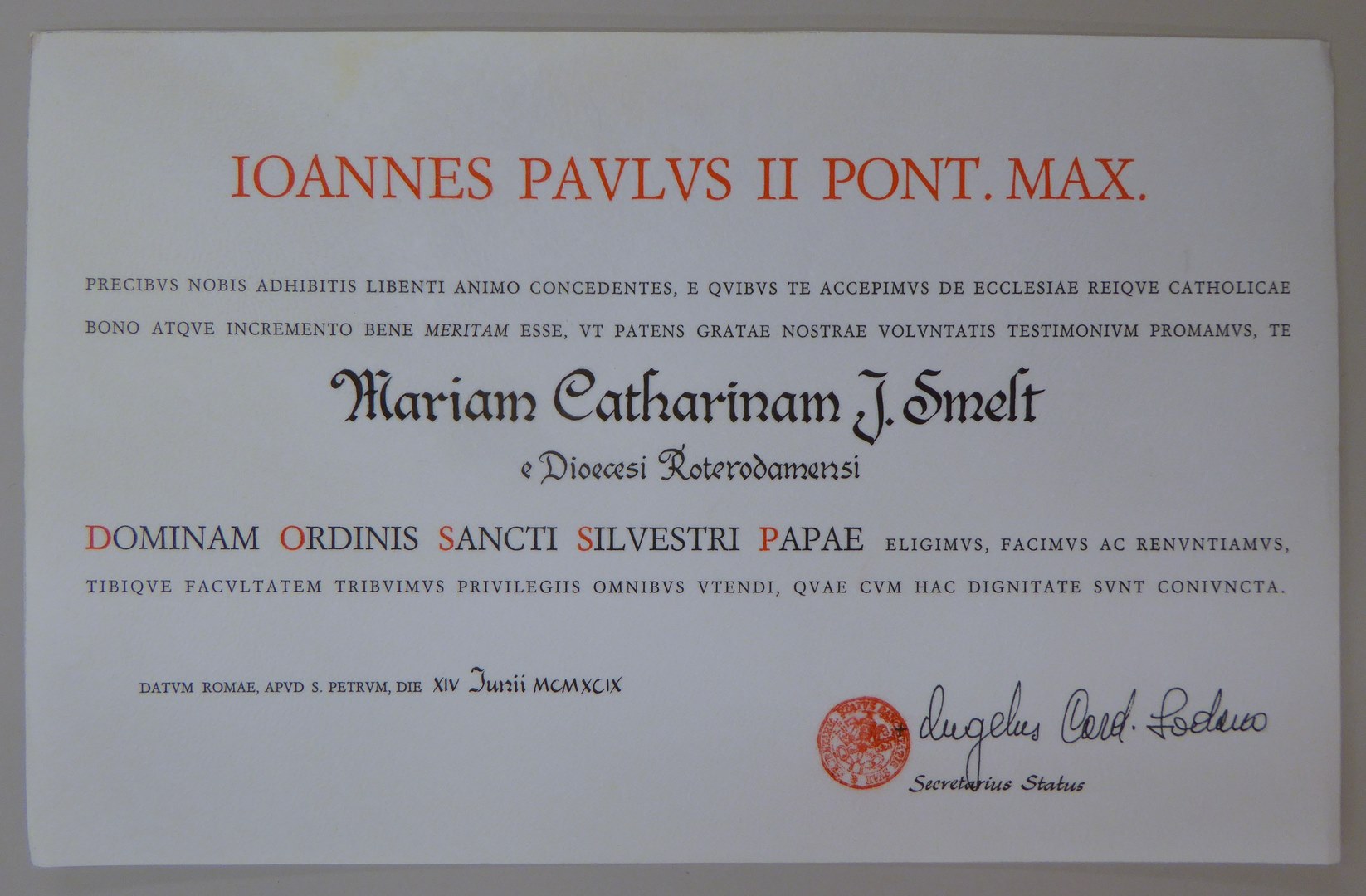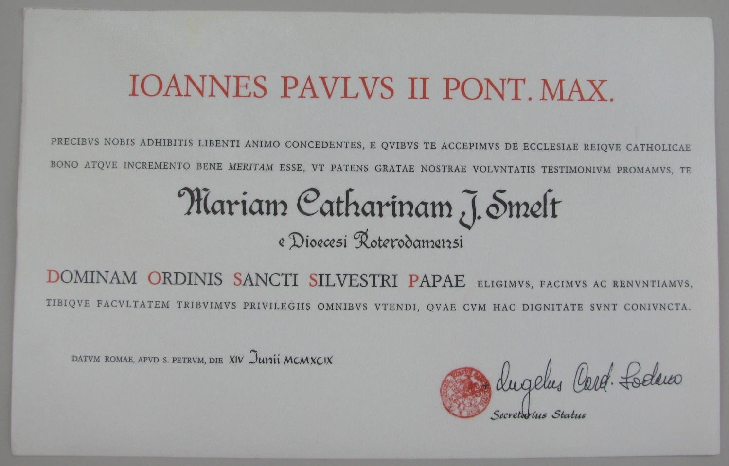 Oorkonde Ridderorde St. Silvester voor Maria Catharina J. Smelt, ondertekend door de kardinaal-staatssecretaris Angelo Soudano