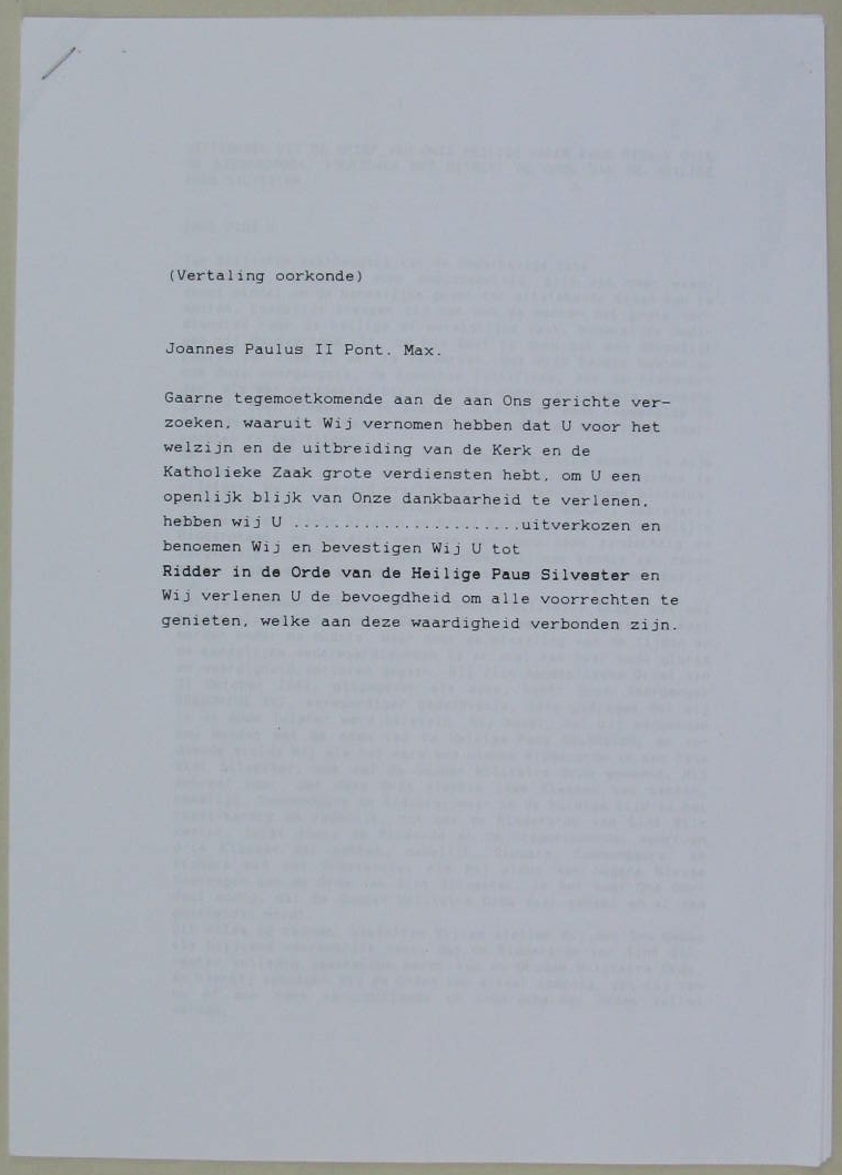 De Equestri ordine S. Silvestri Papae, met losse Nederlandse vertaling t/m p. 11 en vertaling van oorkonde RMCC v959c
