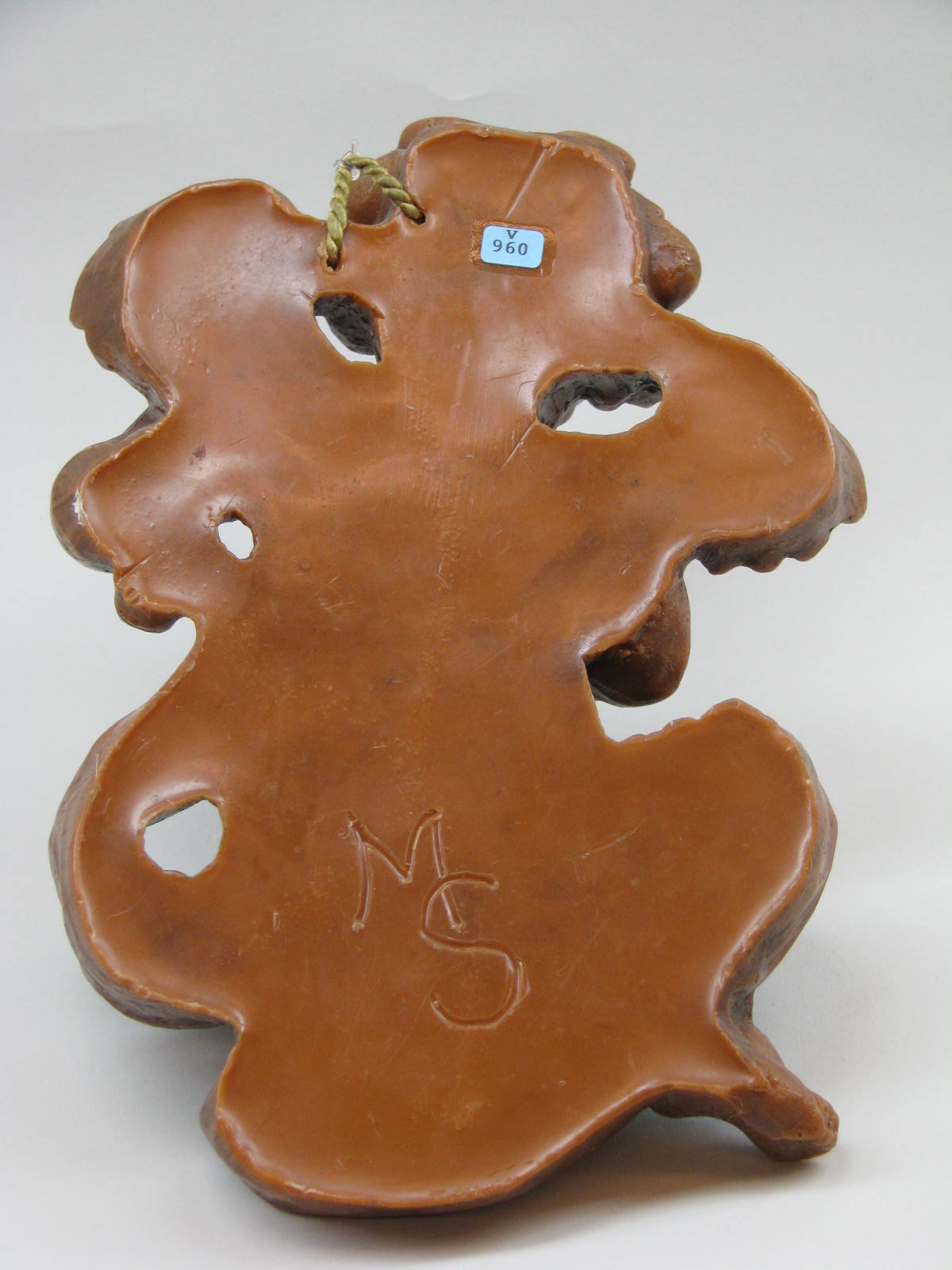 Cherubijn met luit, wanddecoratie in roodbruine was. Op de achterzijde het monogram "MS".