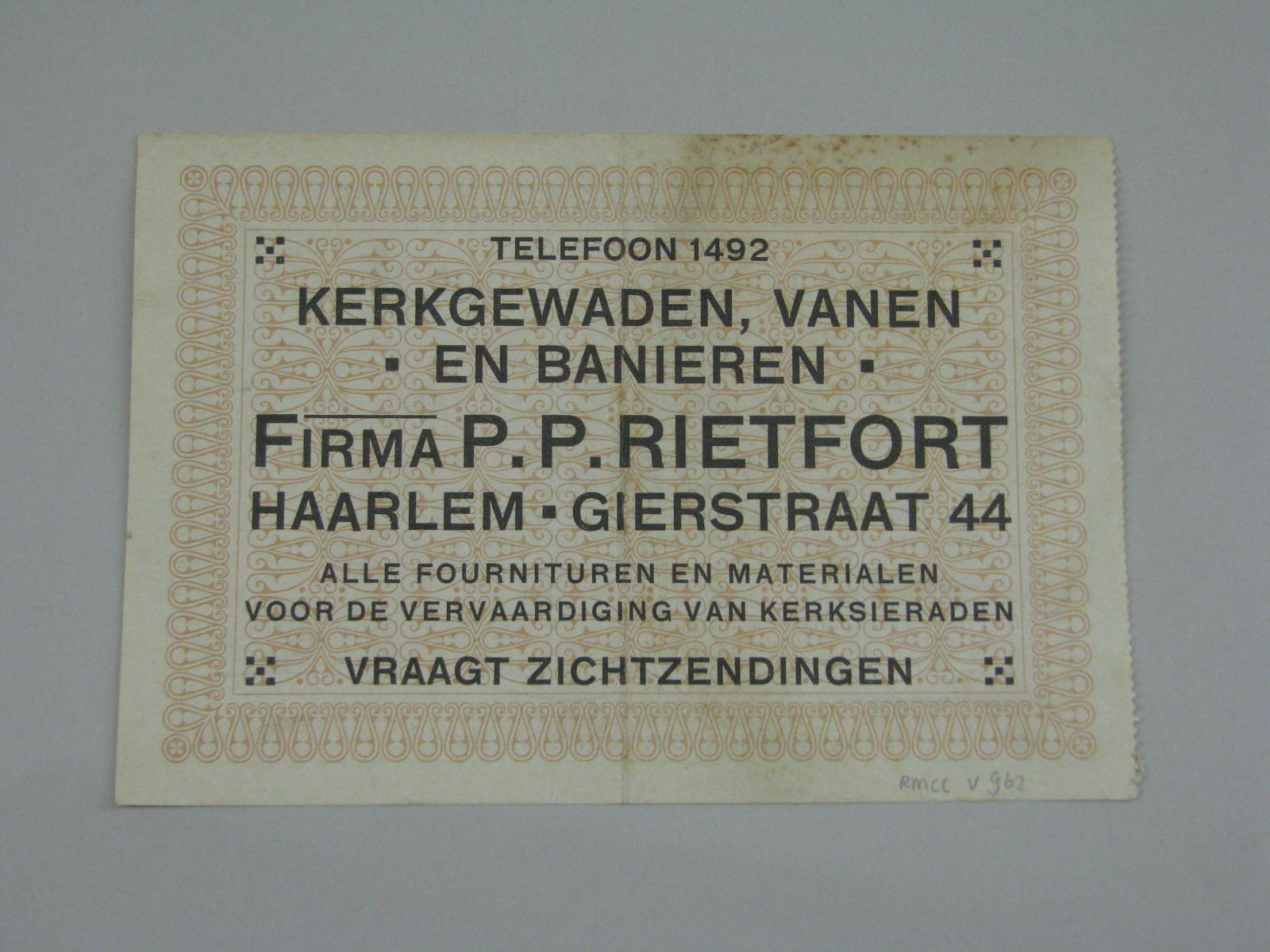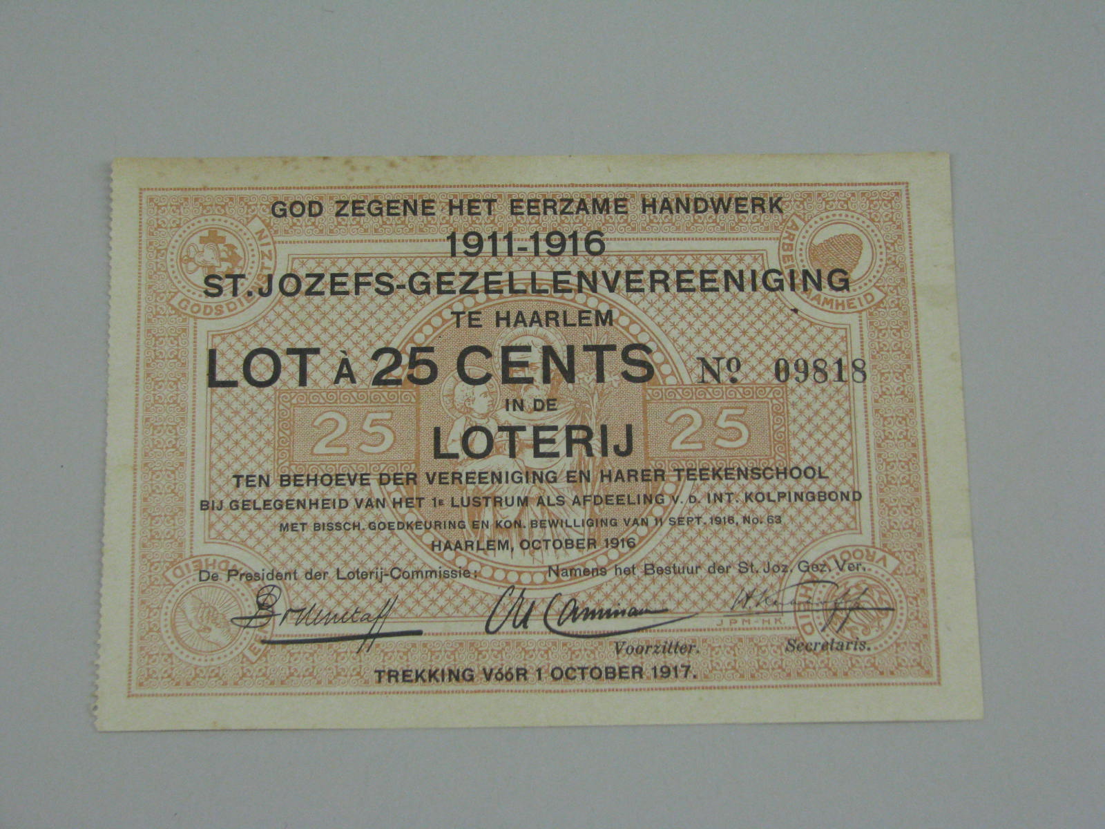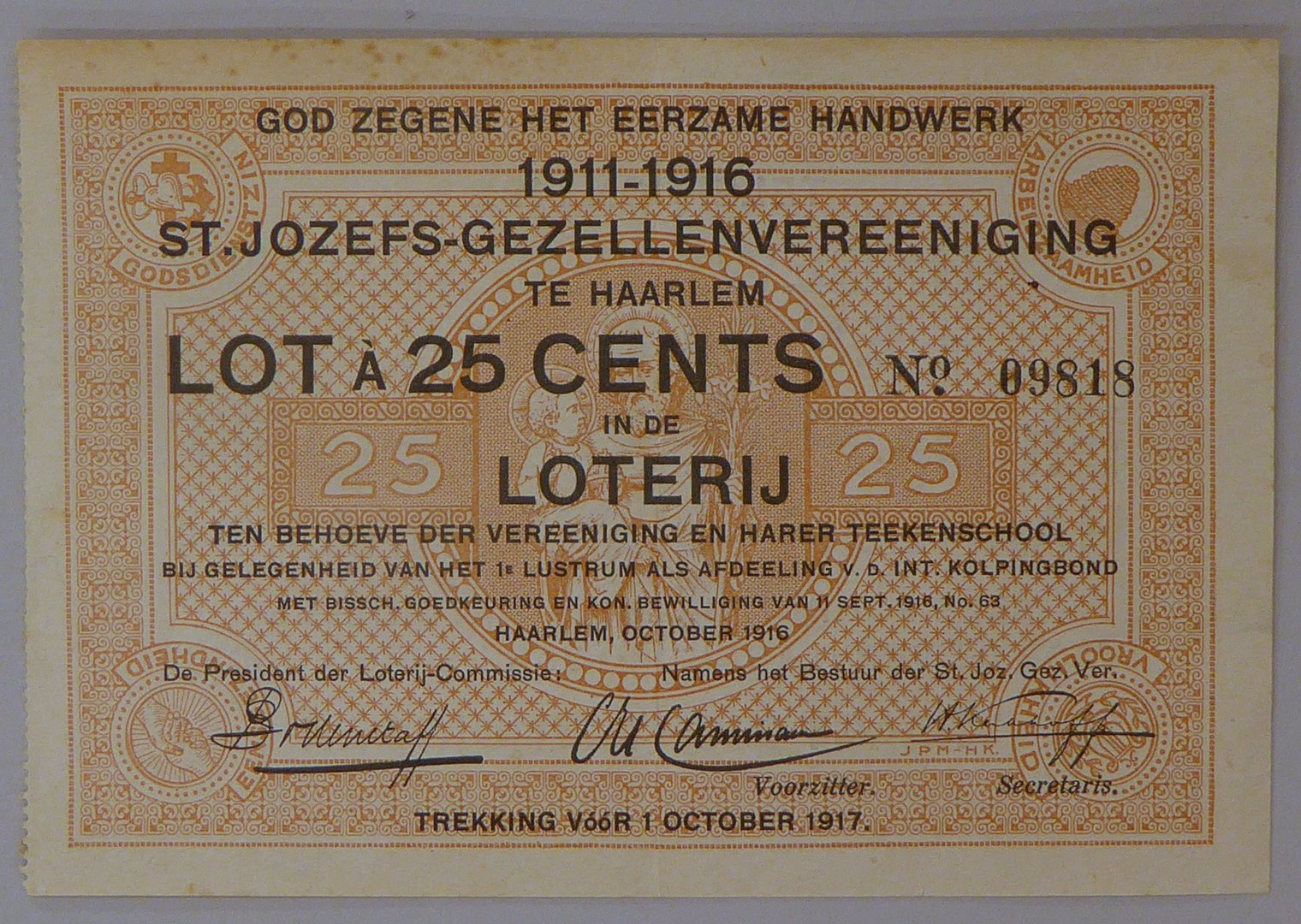 Loterij lot met "... 1911-1916 St. Jozefs-gezellenvereeniging te Haarlem, lot à 25 cents, no. 09818, in de loterij ten behoeve der vereeniging en harer teekenschool ... trekking vóór 1 october 1917", kz. met "... kerkgewaden, vanen en banieren Firma P.P. Rietfort Haarlem ..."