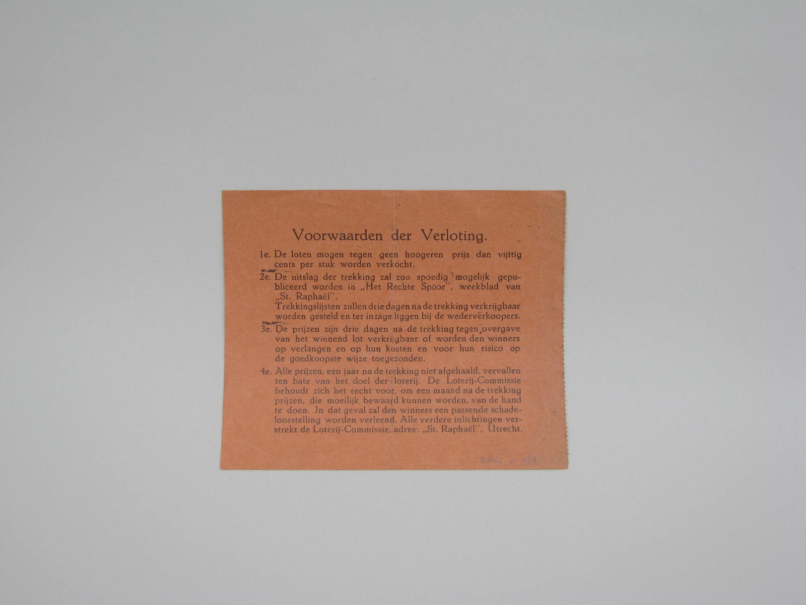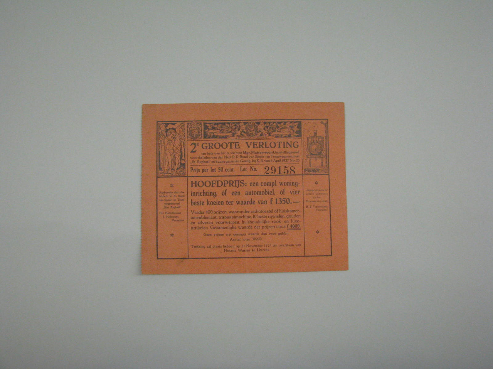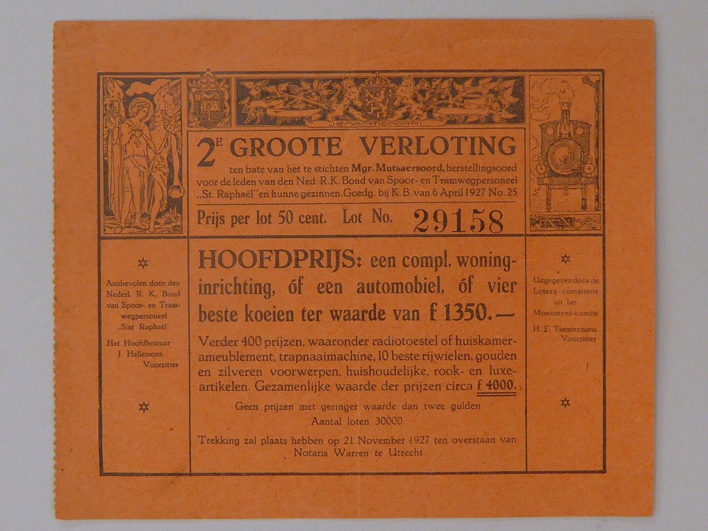 Loterij lot met "2e groote verlooting ten bate van het te stichten Mgr. Mutsaersoord, herstellingsoord voor de leden van de Ned. R. K. Bond van Spoor- en Tramwegpersoneel "St. Raphaël" en hunne gezinnen ..."