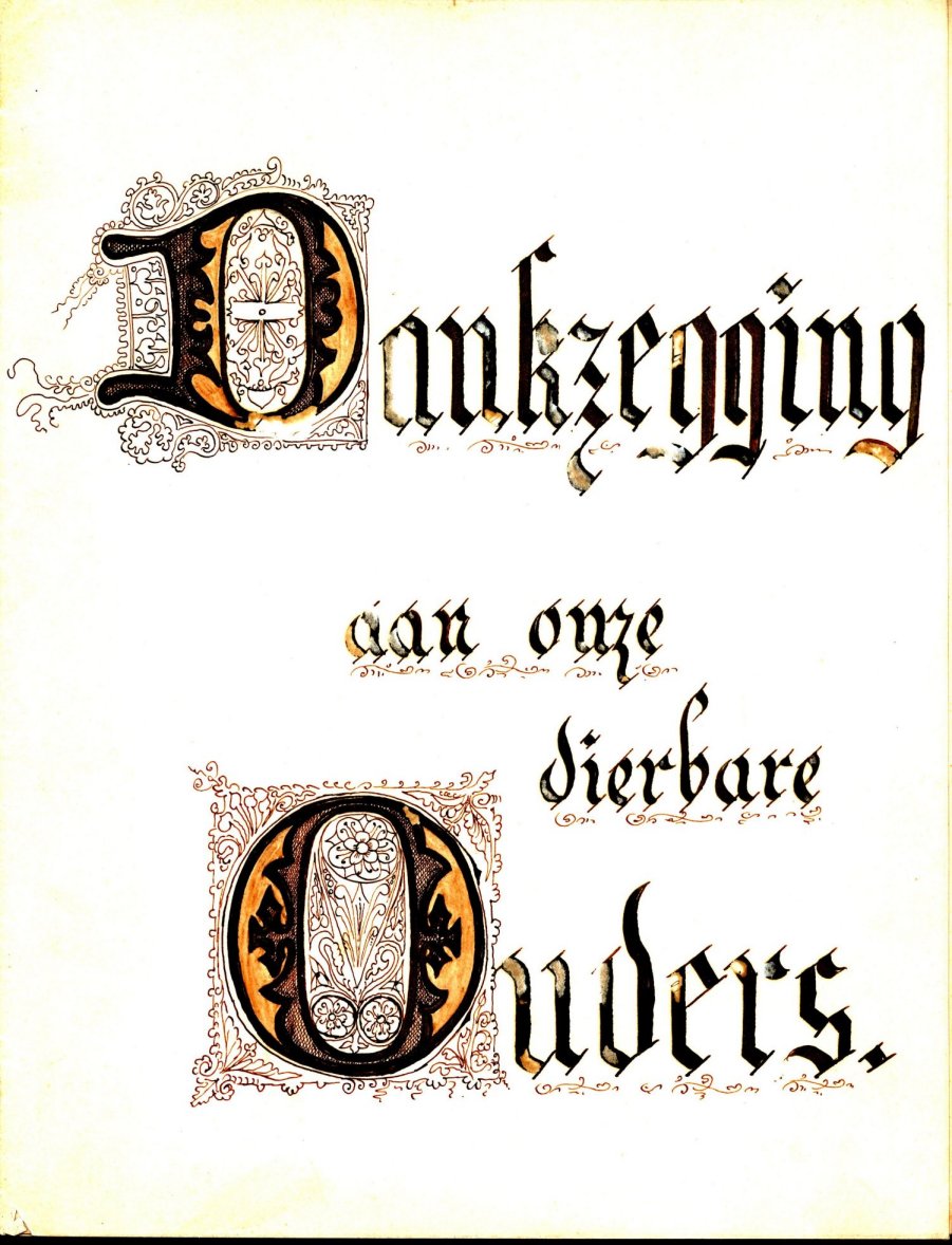 Geschreven Eerste Communiewens met in kalligrafie "Dankzegging aan onze dierbare ouders"