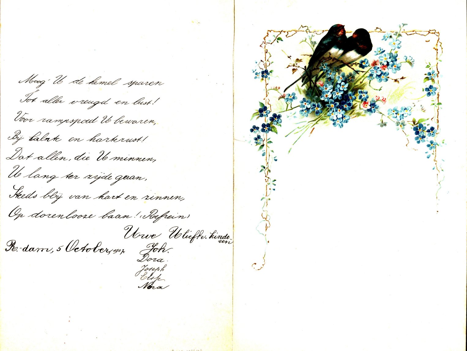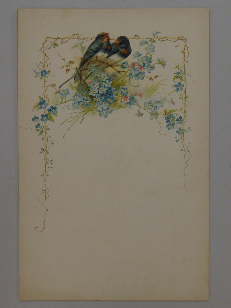 Verjaardagsvers voor vader 'Wees welkom dag van zegen' met op de voorkant een reliëf met kleurendruk van twee boerenzwaluwen en vergeet-mij-nietjes