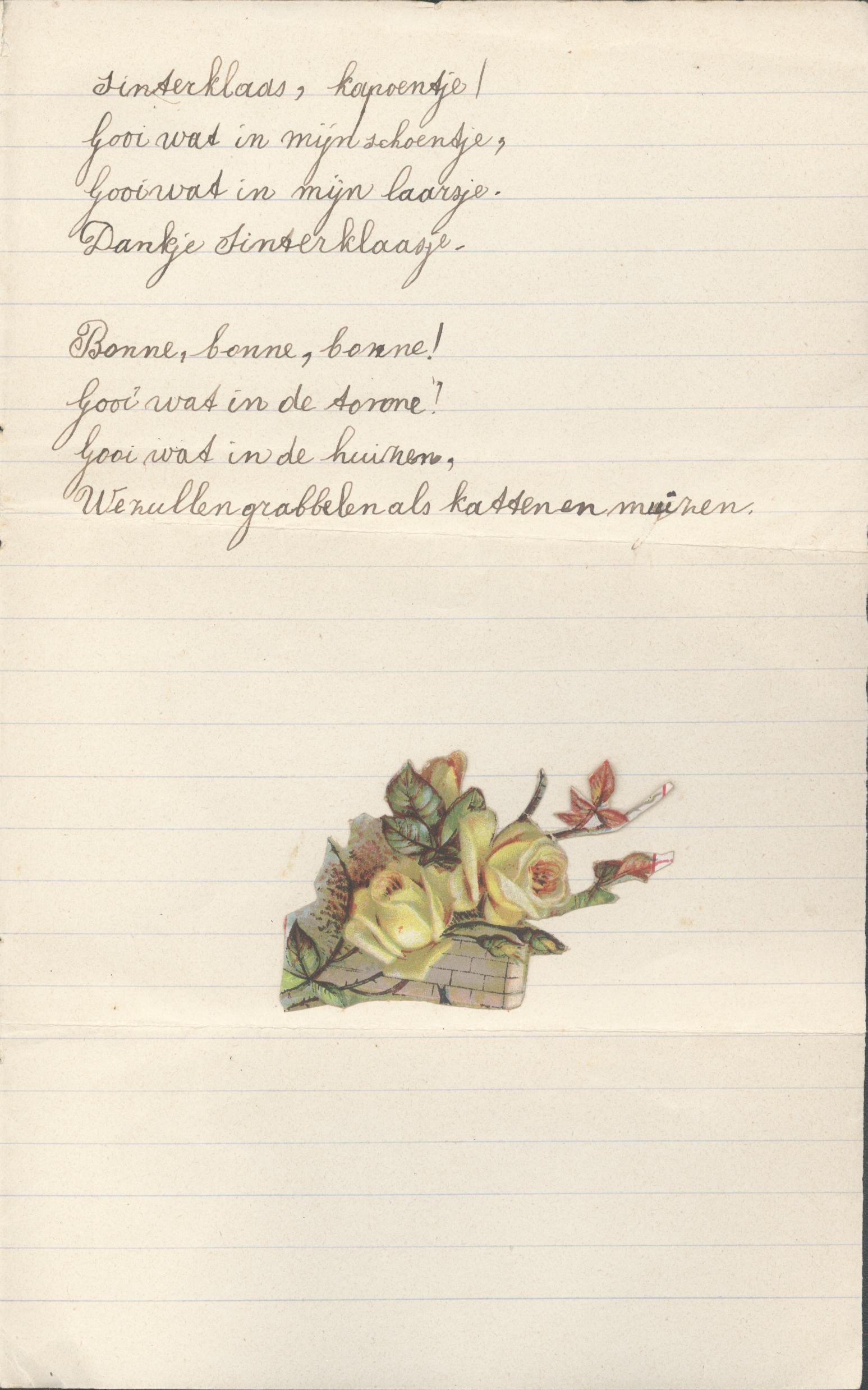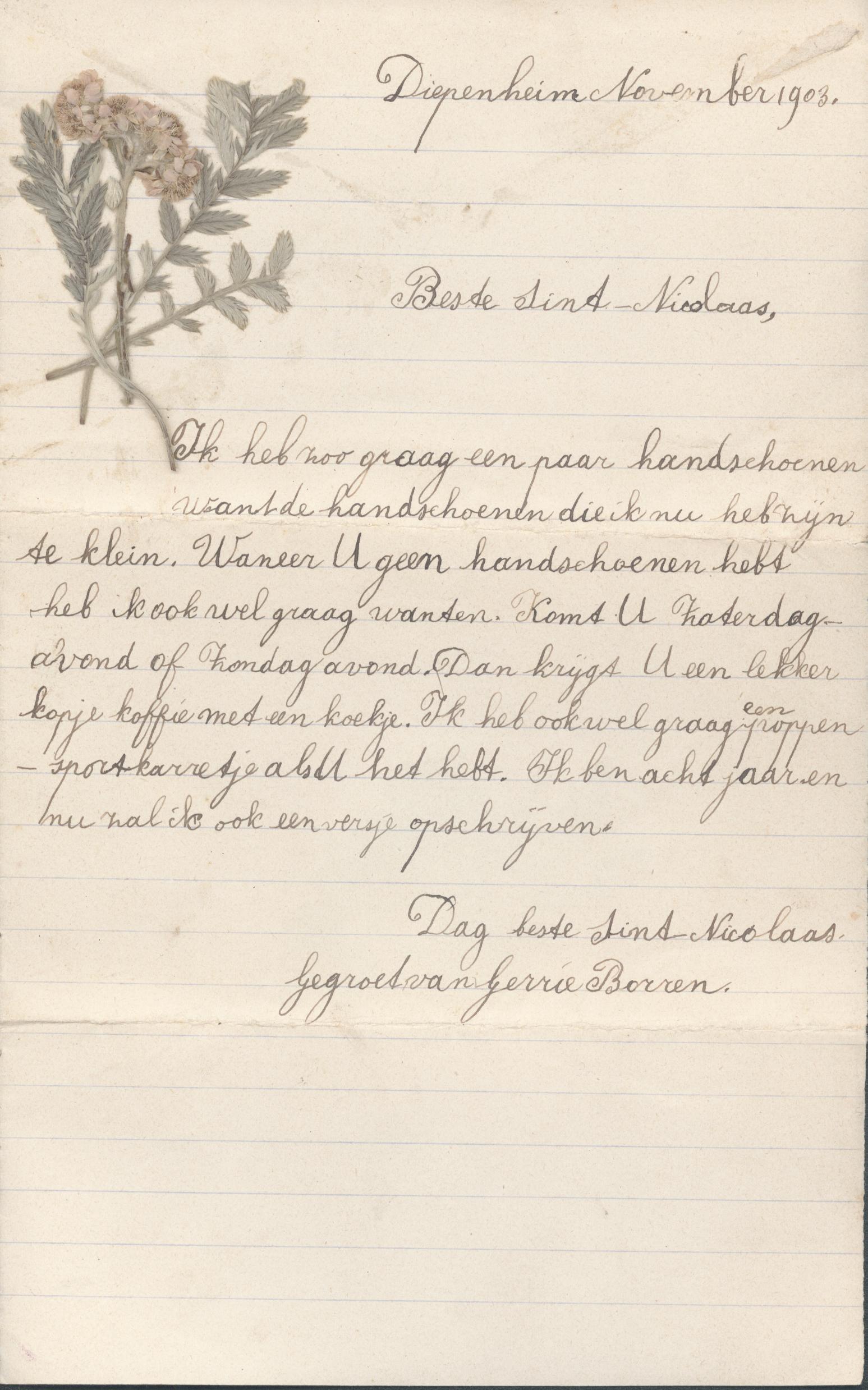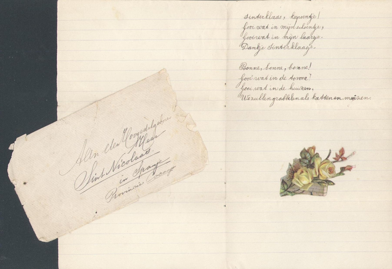 Verlanglijstje voor Sint-Nicolaas van Gerrie Borren voor een paar handschoenen en een poppensportkarretje, ook met "Sinterklaas, kapoentje ...", met envelop