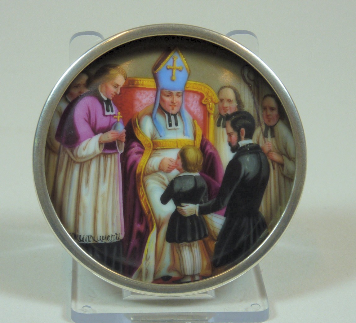 Medaillon waarin op porselein geschilderde afbeelding van bisschop op zetel die H. Communie uitreikt aan jongetje