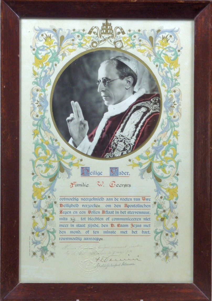 Apostolisch zegenformulier met foto van paus Pius XII aan familie W. Geerars