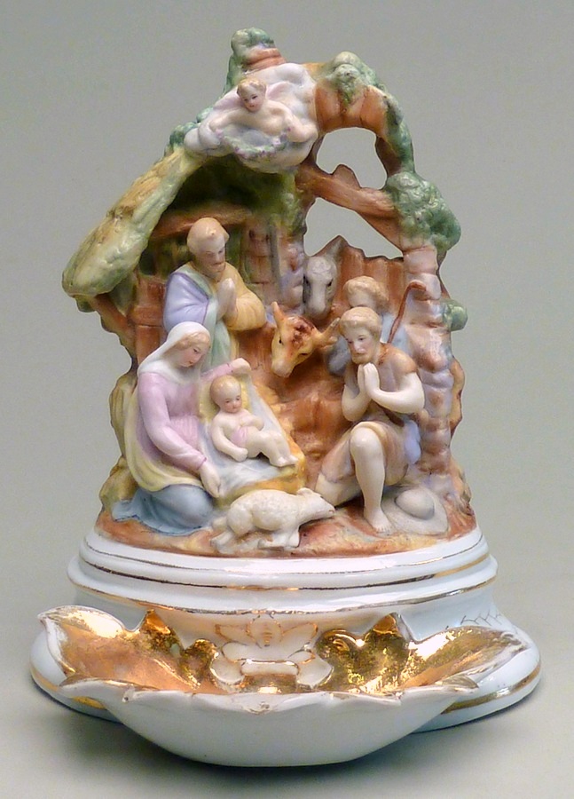Staand wijwaterbakje met beeldje van aanbidding der herders