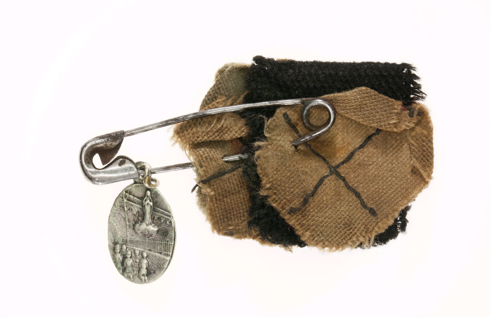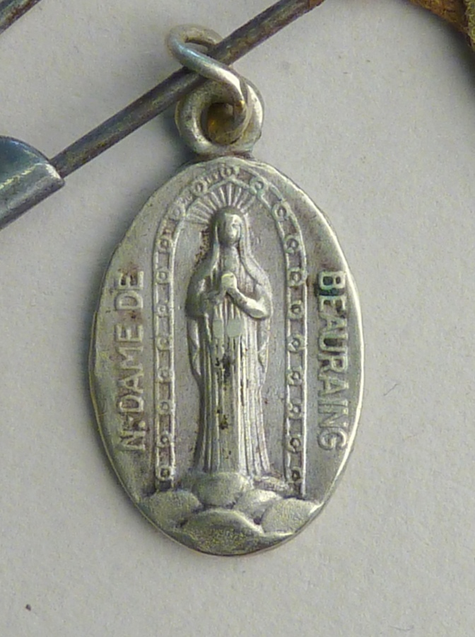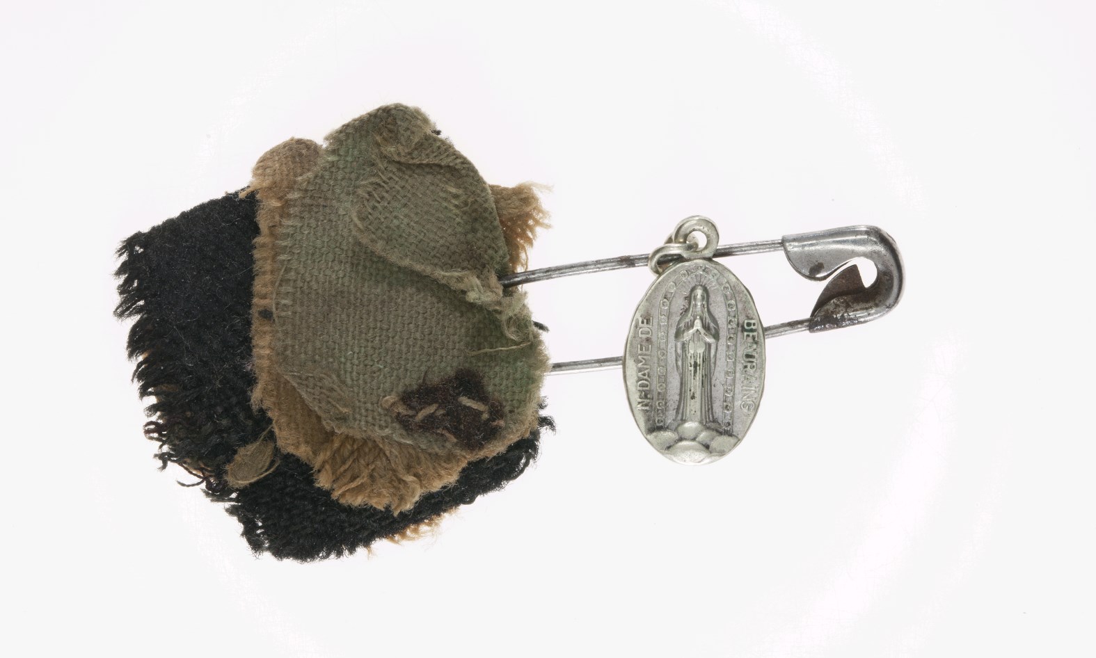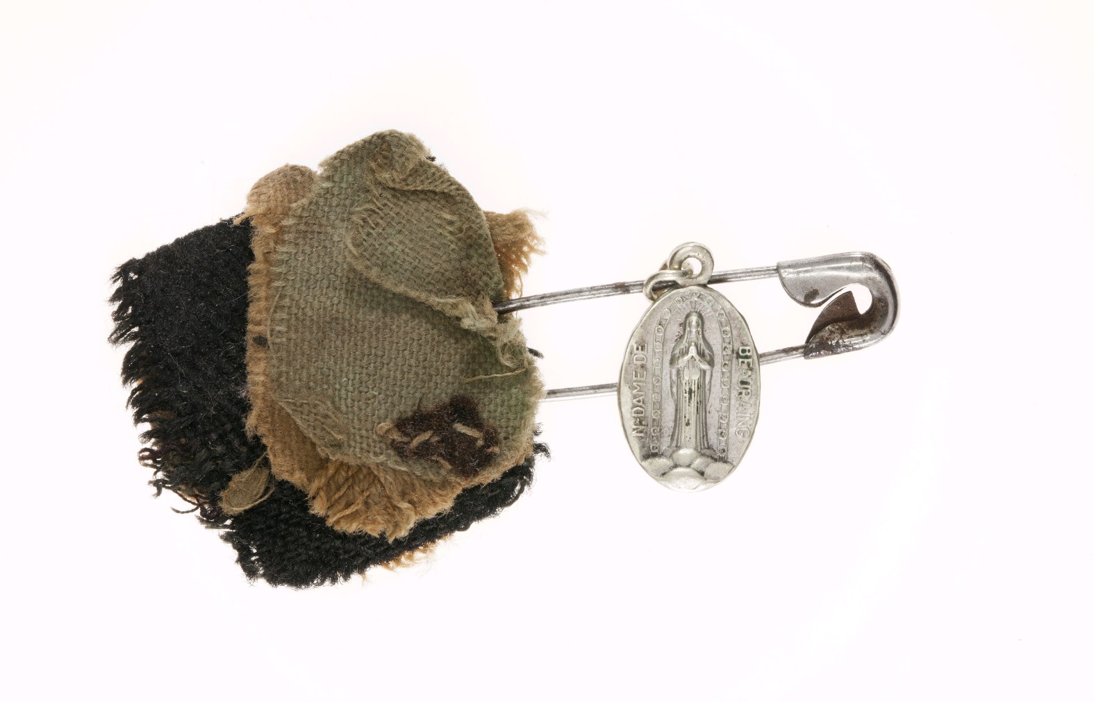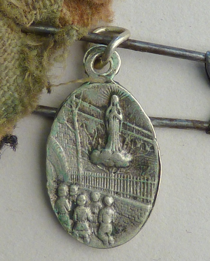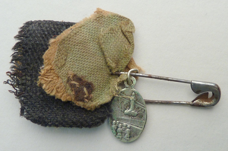 Veiligheidsspeld met hanger Notre Dame de Beauraing, kz. het verschijningswonder en drie textielfragmenten