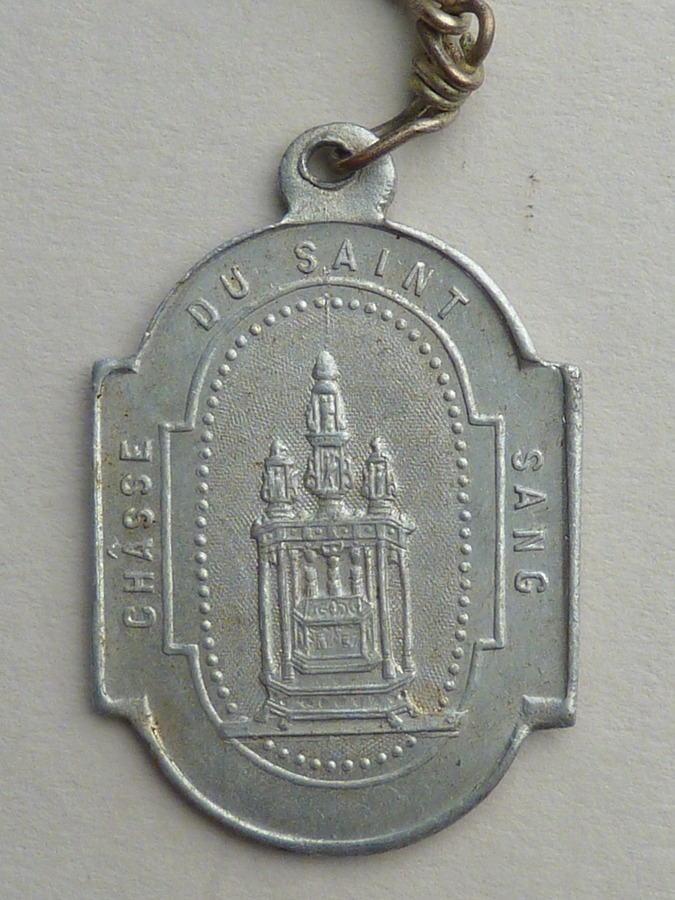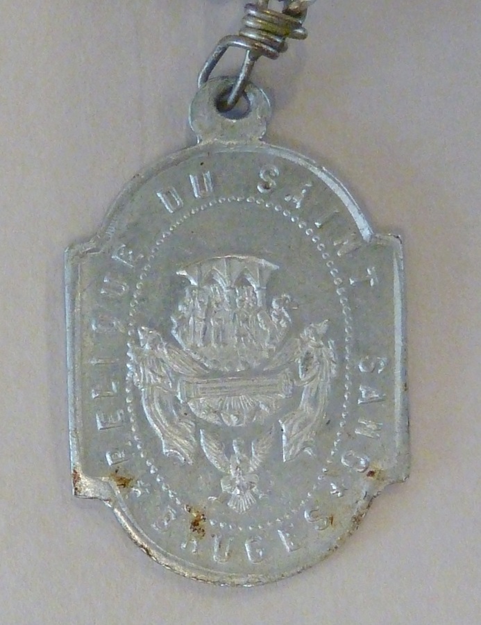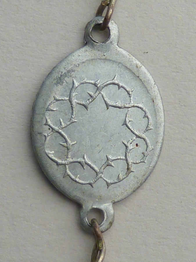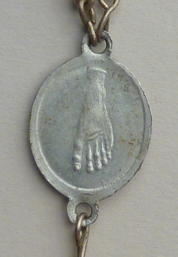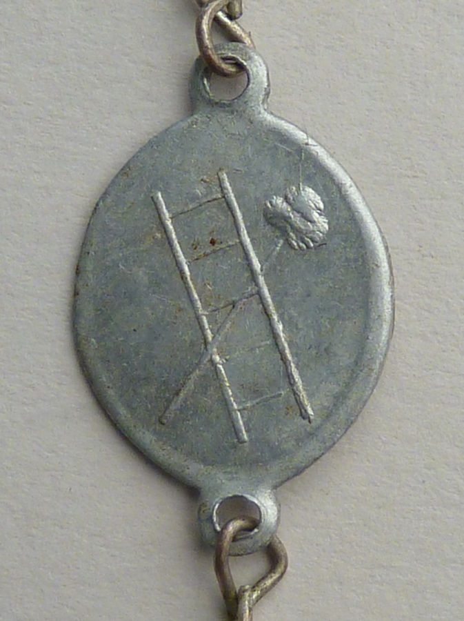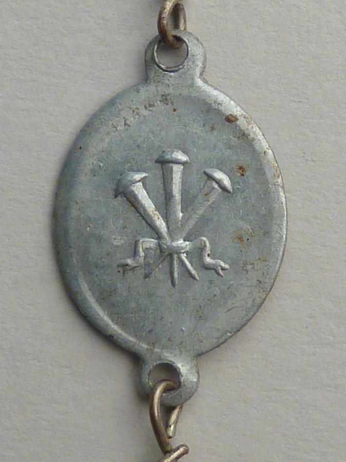 Rozenkrans met rode kunststof kralen en aluminium schildjes met Arma Christi en verwijzing naar het Heilig Bloedreliek van Brugge