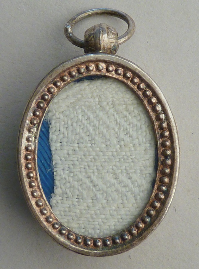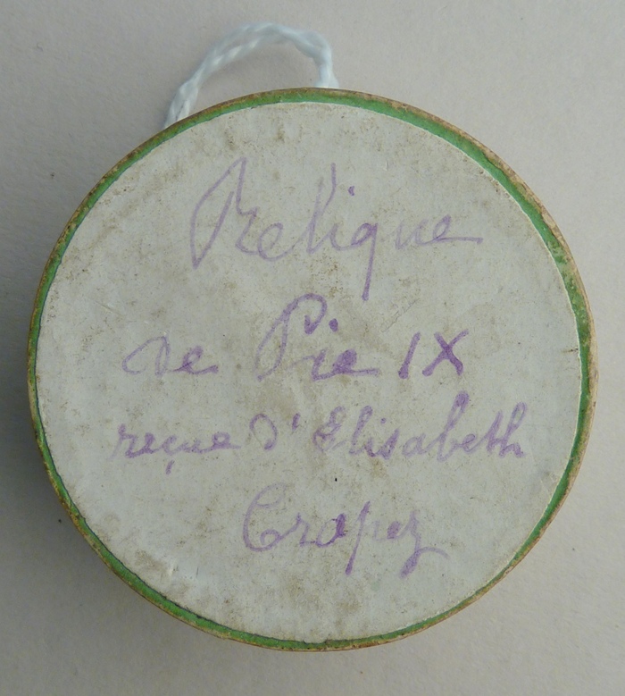 Ovaal reliekmedaillon met Maria met kind op de maansikkel, kz. achter doorzichtig kunststof een wit textielreliek van paus Pius IX. Het medaillon wordt bewaard in een rond pillendoosje waarop een mededeling van één van de vorige eigenaars: 'relique de Pie IX reçue d'Elisabeth Crapez' (een moeder-overste in het midden van de 19e eeuw van een ...