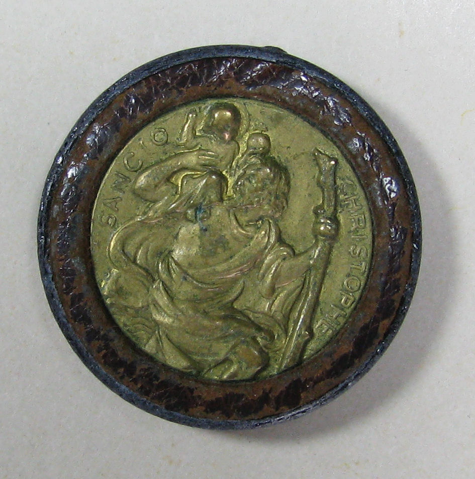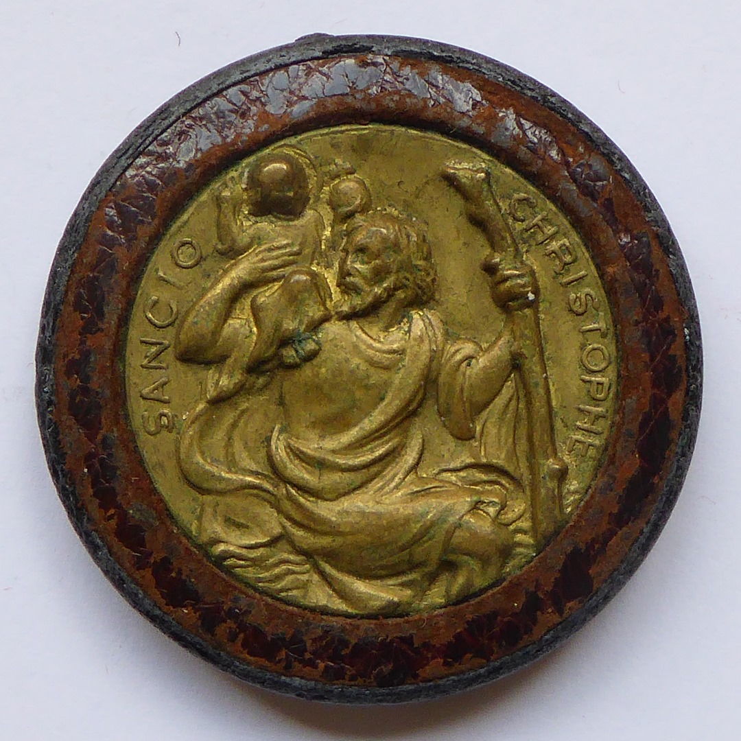 Kunststof reliëf als een penning, in leren omlijsting. Opschrift 'Sancio Christophe'