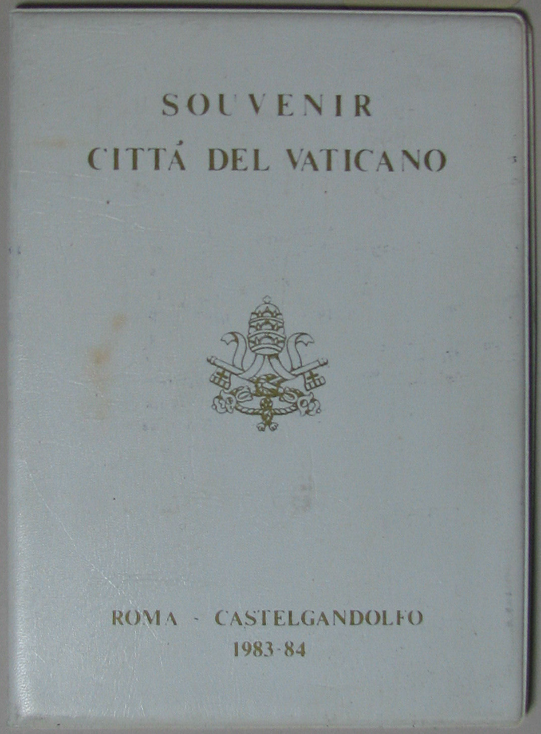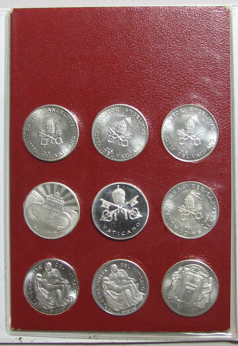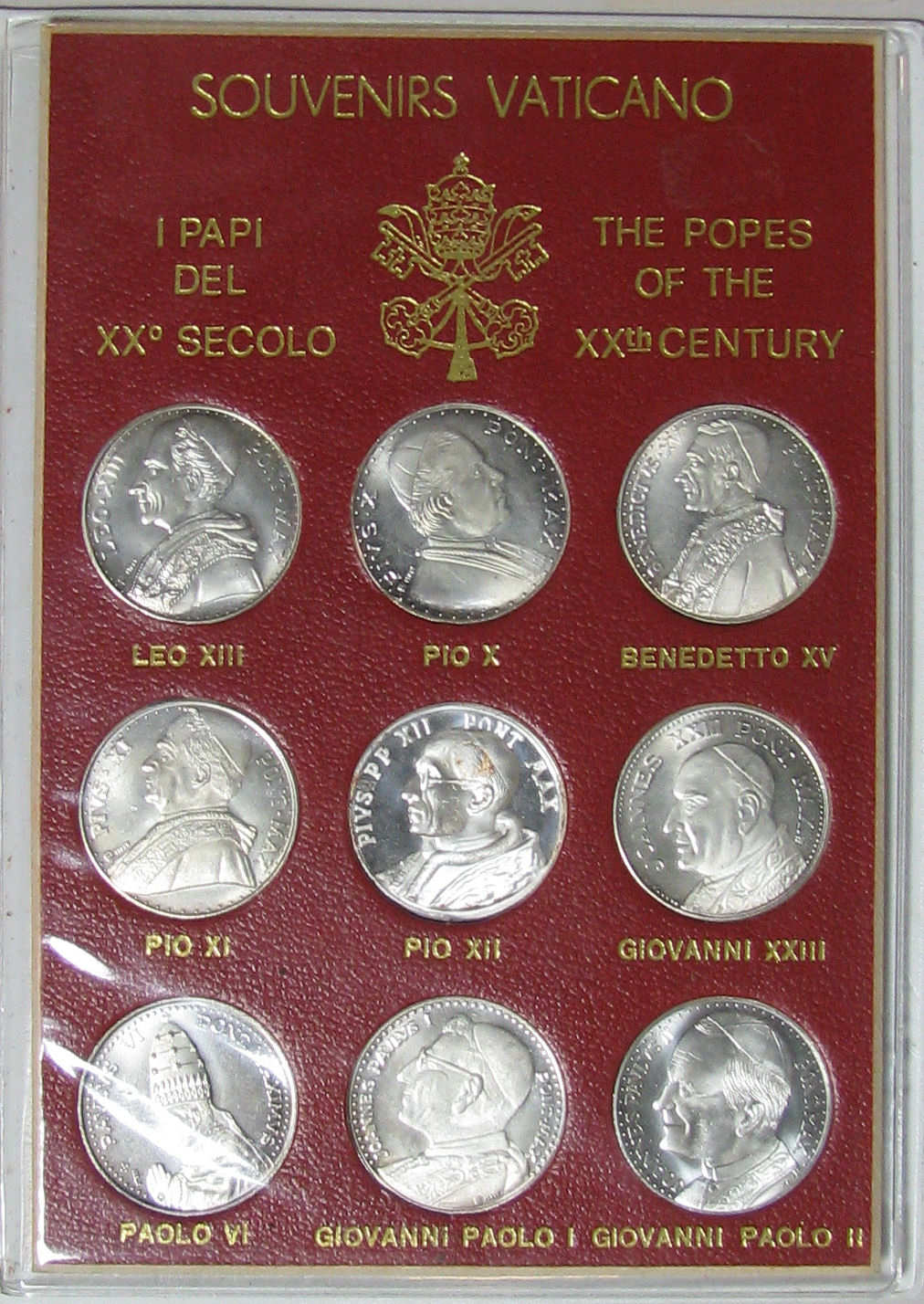 Witte kunststof map, 'Souvenir citta' del Vaticano, Roma - Castelgandolfo 1983-83', waarin een rode kartonnen kaart in kunststof hoes, 'Souvenirs Vaticano, I papi del XX' secolo, The popes of the XXth century'. Hierin 9 penningen met en profil portretten van de pausen: Leo XIII (kz.: wapen), Pius X (kz.: wapen), Benedictus XV (kz.: wapen), Pius ...