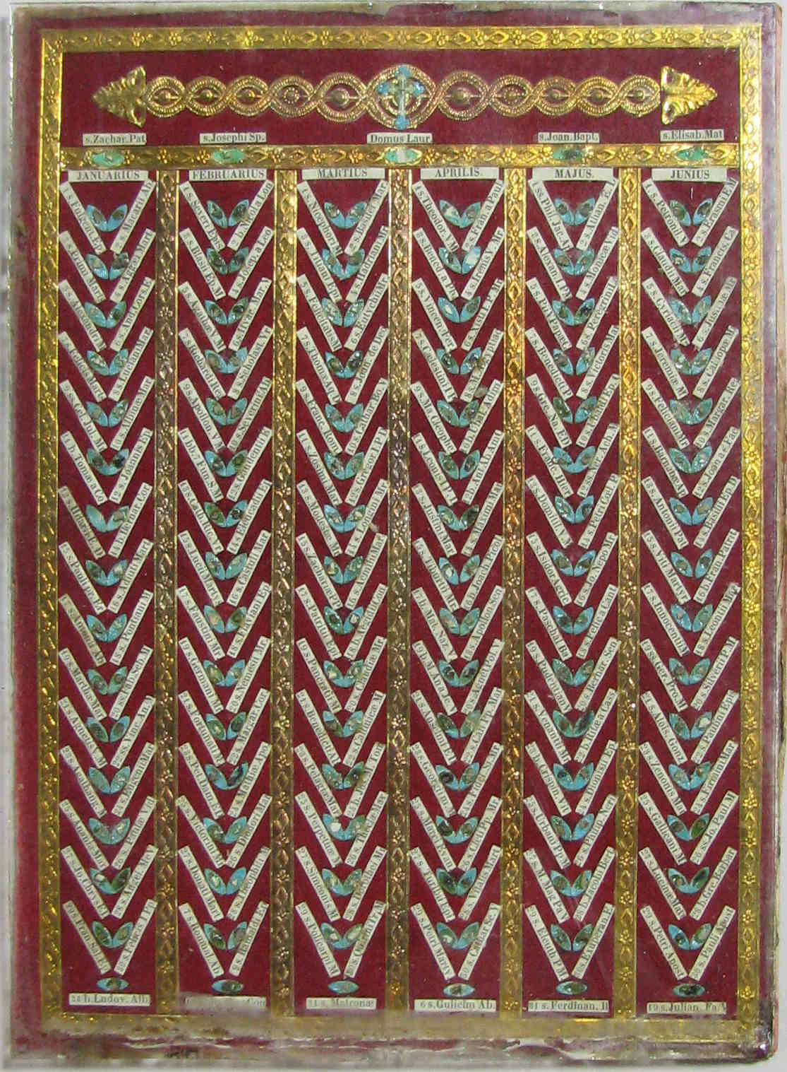Kalender voor januari-juni met relieken voor elke dagheilige, waarboven een kruisreliek en de relieken voor H. Zacharias, H. Jozef (Sp.?), Domus Laur., H. Johannes de Doper, H. Elisabeth. Rood fluweel met goudpapier op karton. De maanden zijn kolommen, met voor elke dag de heilige op papier, waarnaast een stukje blauw papier met een reliek. Dit ...
