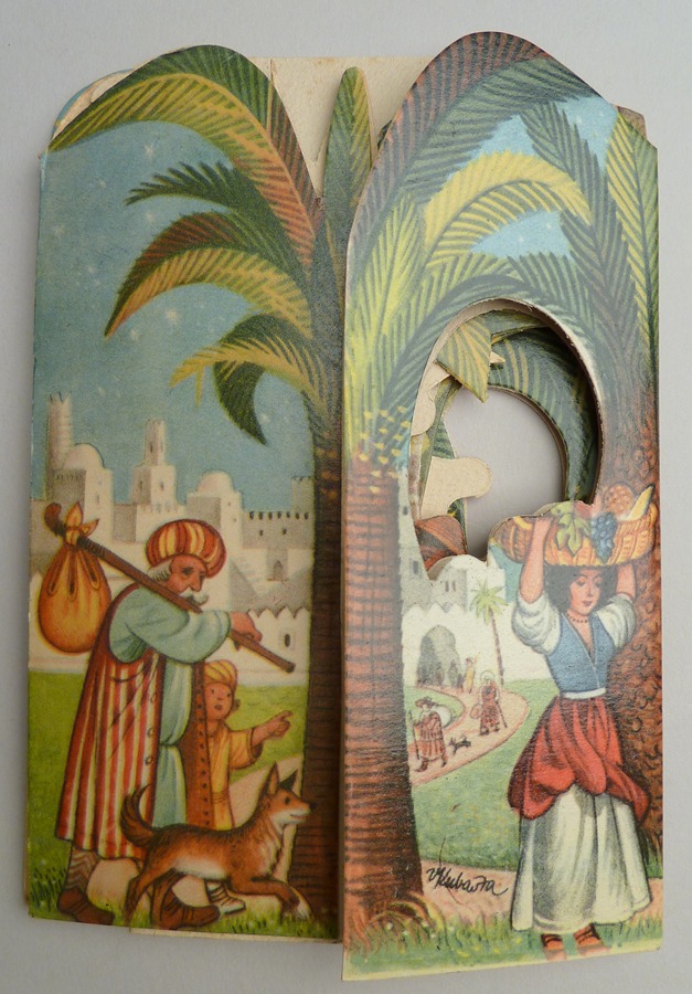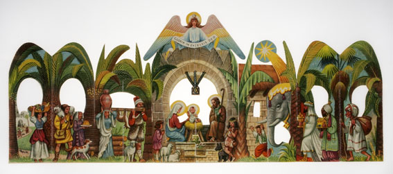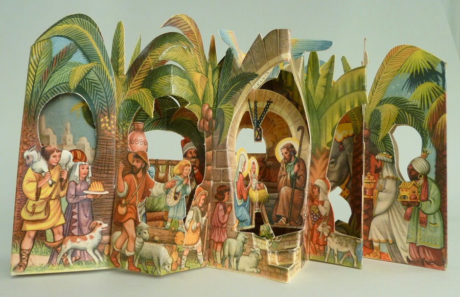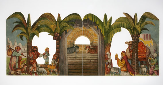 Gekleurde kartonnen kerststal in pop-up vorm, met stal onder palmen, waarbij herders, de wijzen uit het oosten en dieren