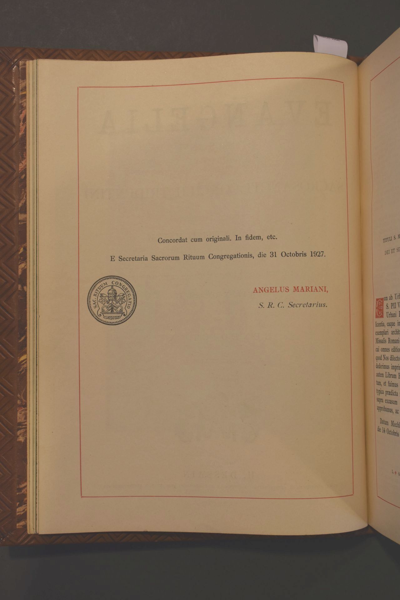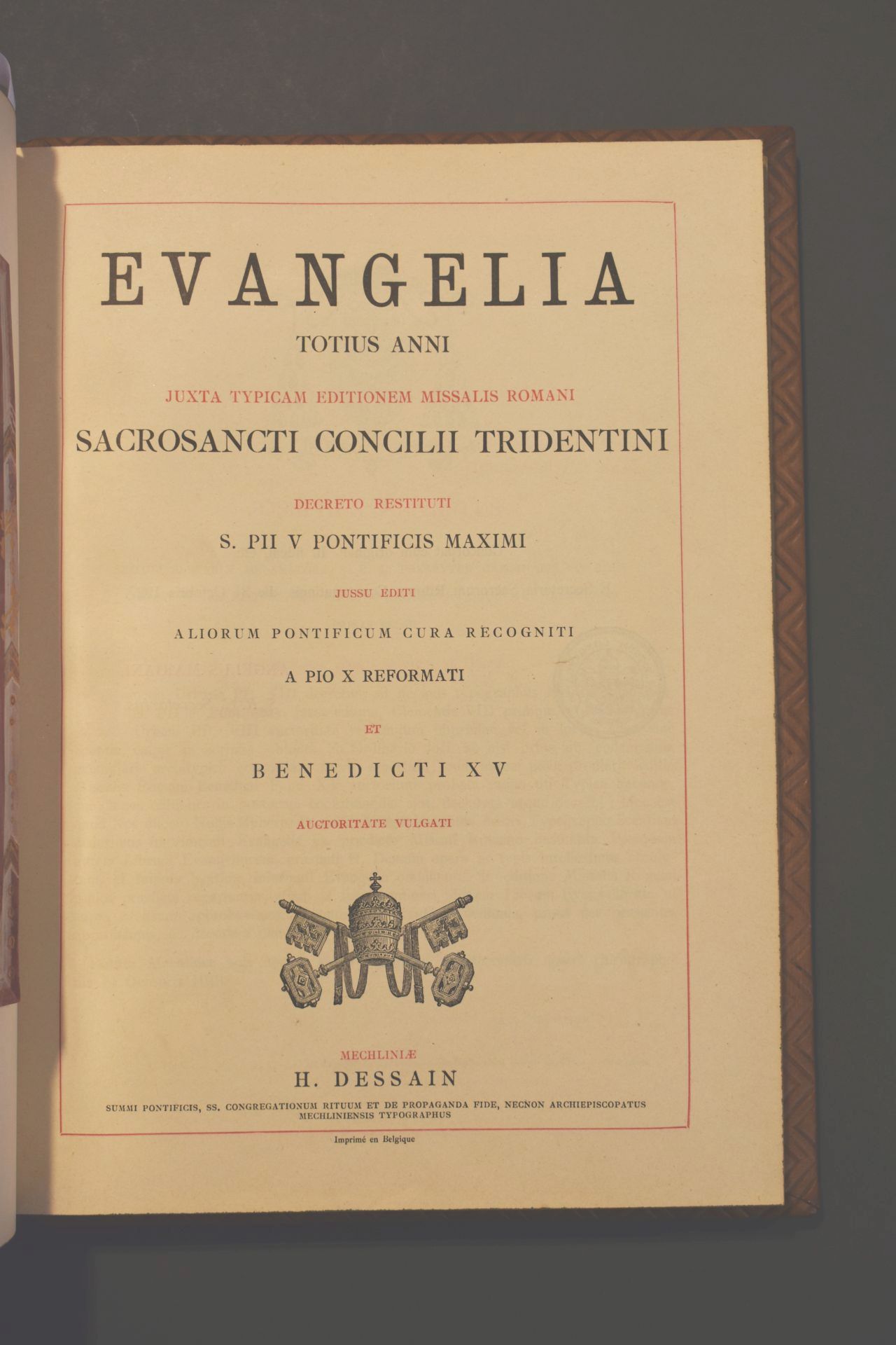 Evangelia totius anni juxta typicam editionem missalis romani sacrosancti concilii tridentini decreto restituti S. Pii V pontifix maximi jussu editi aliorum pontificum cura recogniti a Pio X reformati et Benedicti XV auctoritate vulgati