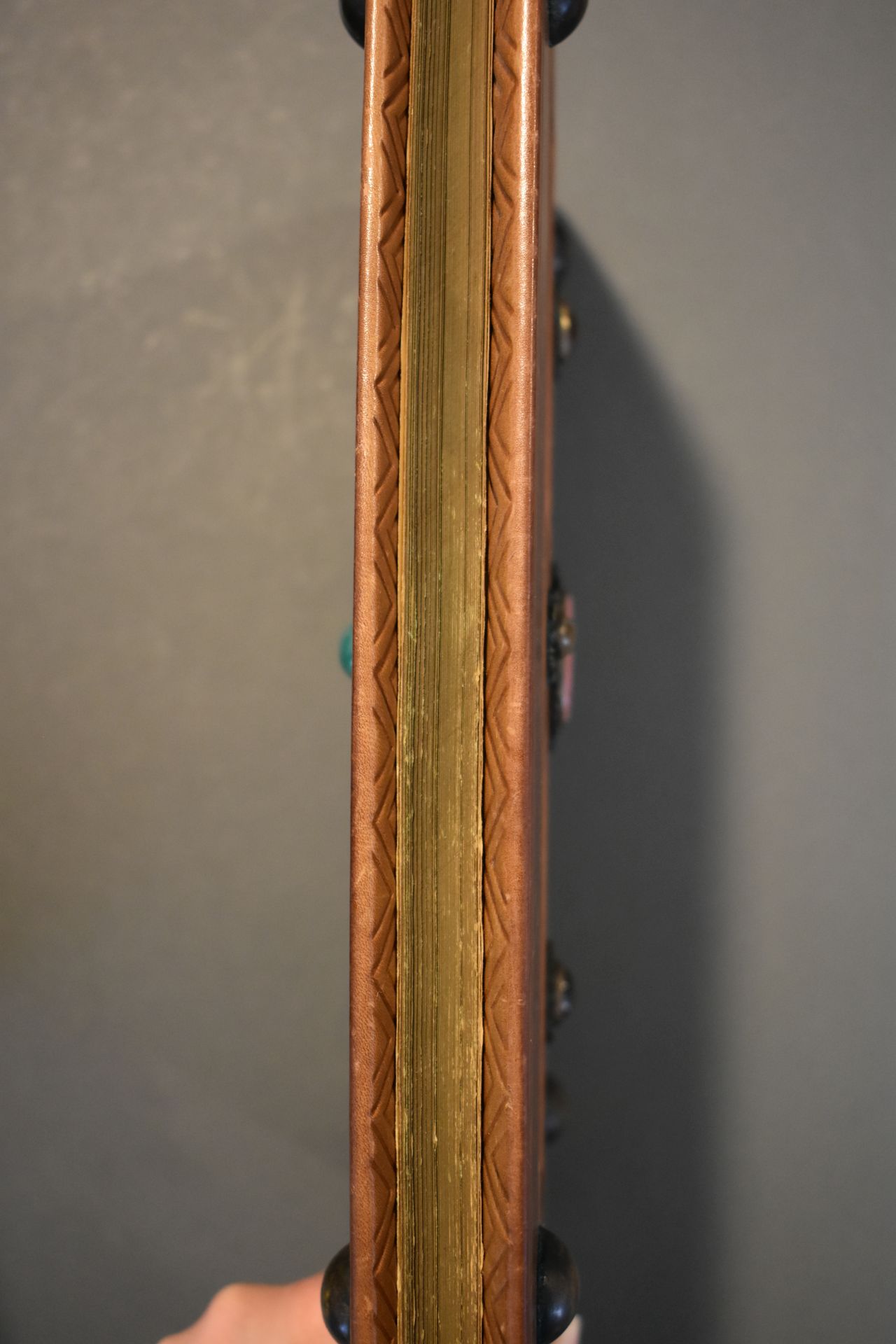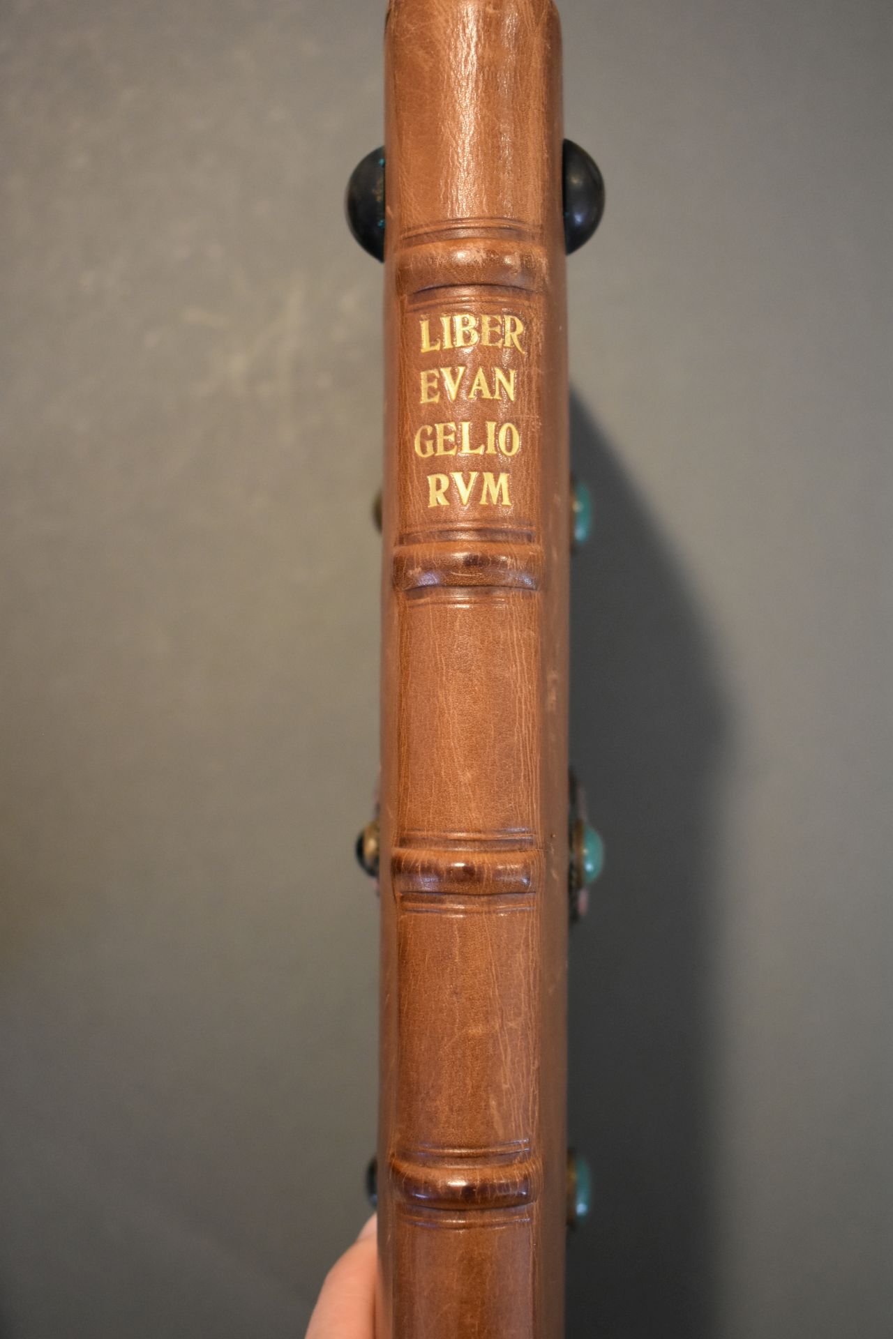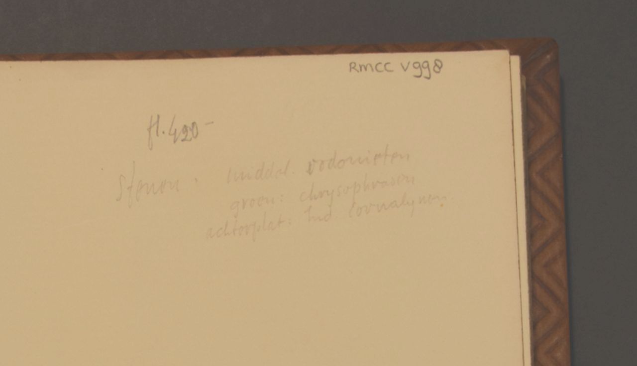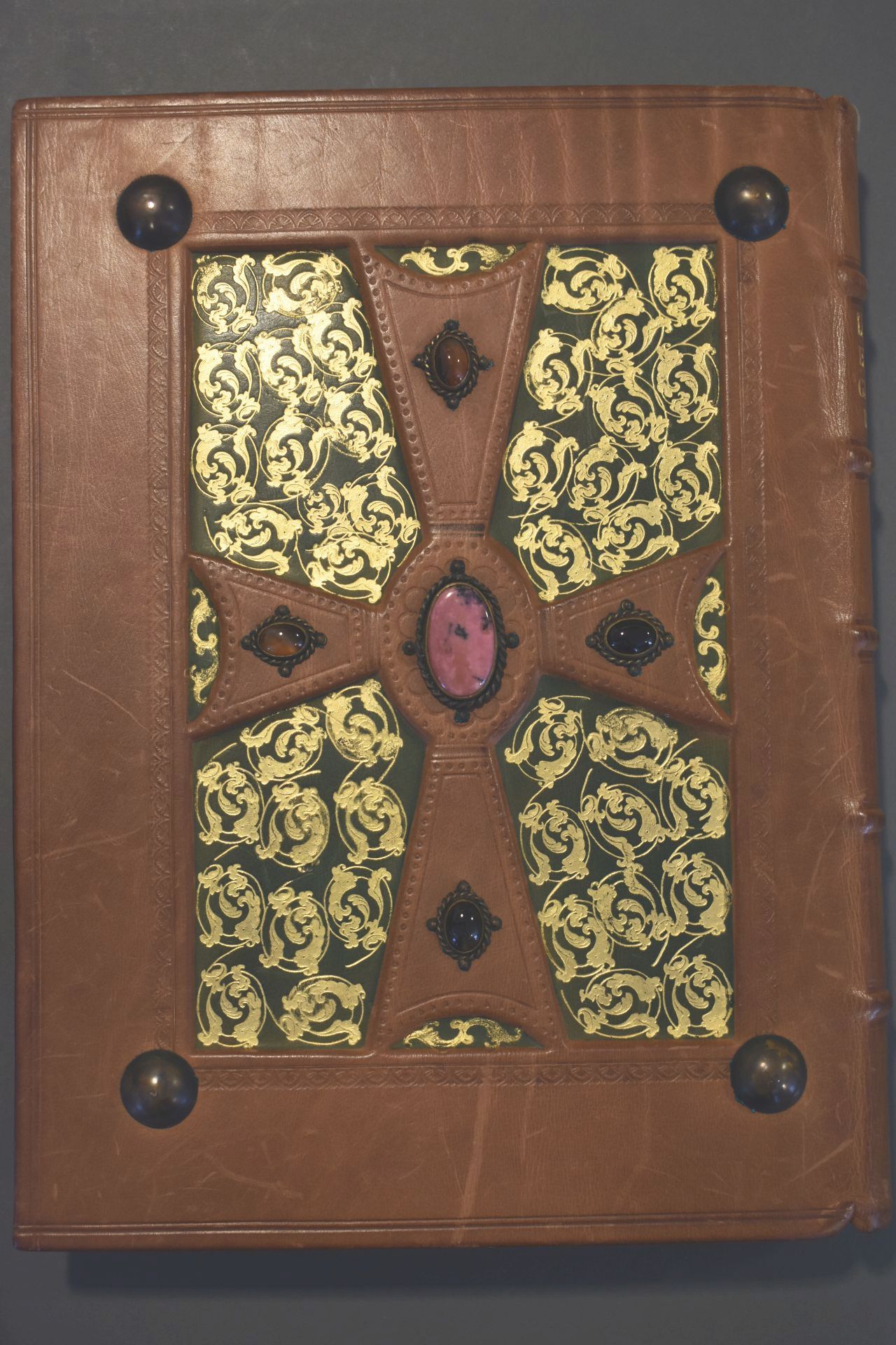 Boek met boekband waarop in zilveren zetingen op het voorplat vier grnoene chrysoprasen en op het achterplat vier bruine carneolen zijn bevestigd. De middenstukken zijn roze met zwarte rhodonieten. Het boek wordt bewaard in een rood foedraal
