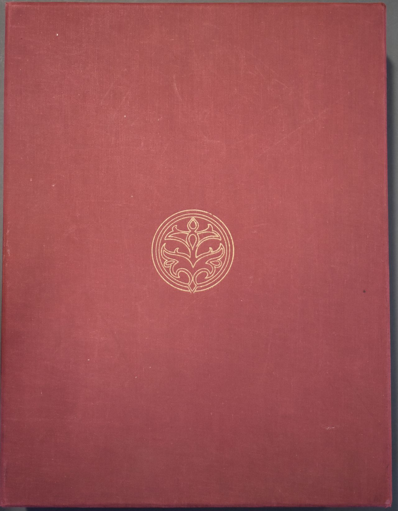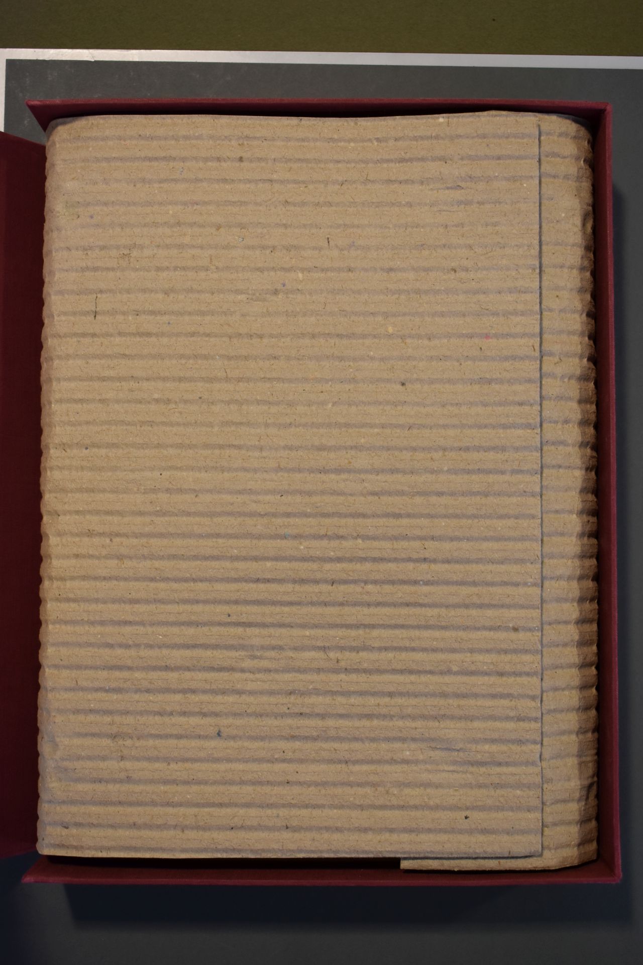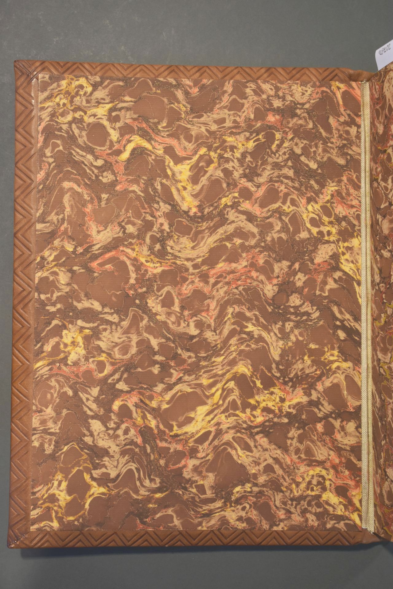 Boek met boekband waarop in zilveren zetingen op het voorplat vier grnoene chrysoprasen en op het achterplat vier bruine carneolen zijn bevestigd. De middenstukken zijn roze met zwarte rhodonieten. Het boek wordt bewaard in een rood foedraal