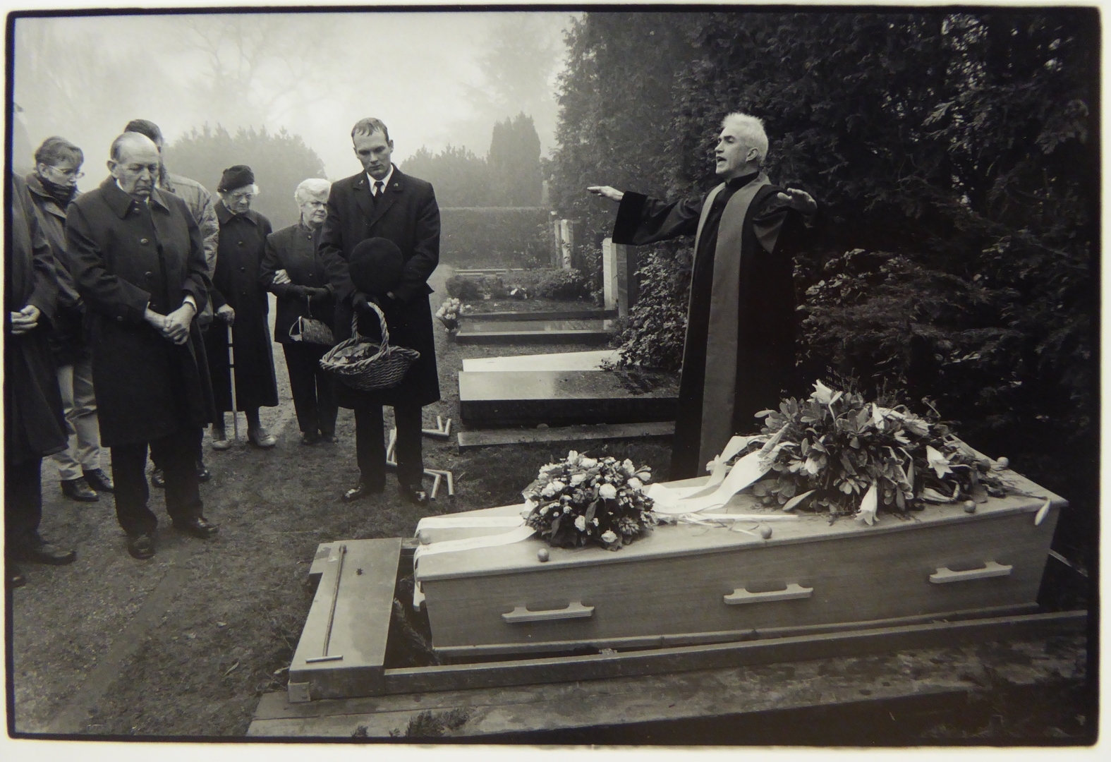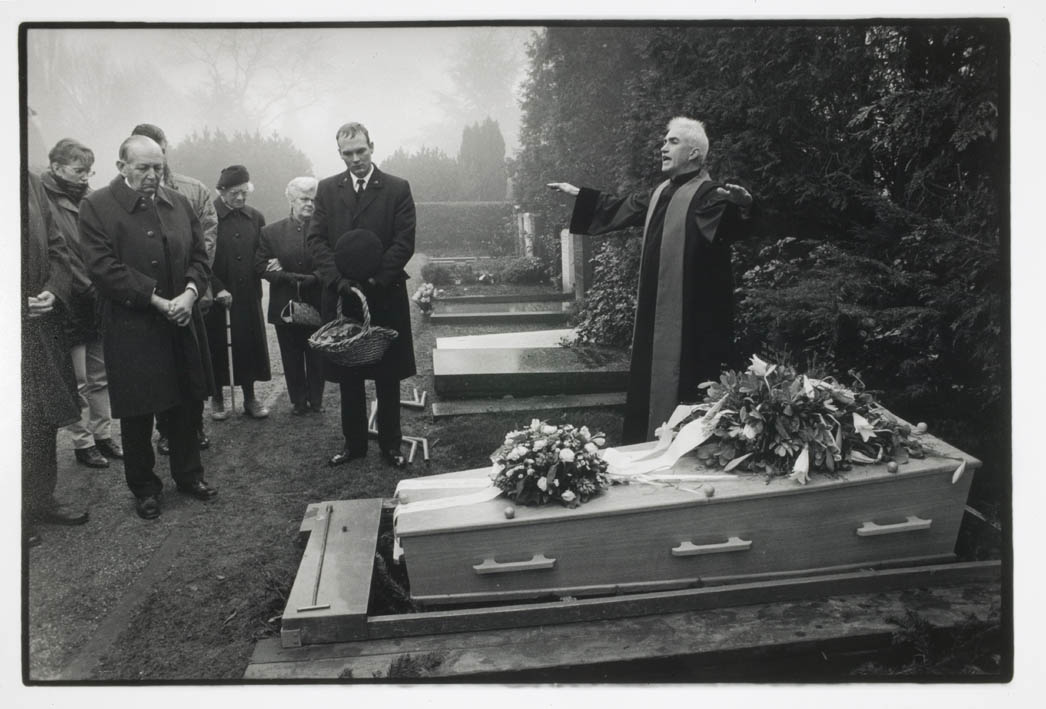 Hervormd predikant Jos de Heer (Nicolaaskerk, Utrecht) tijdens een begrafenis op het kerkhof