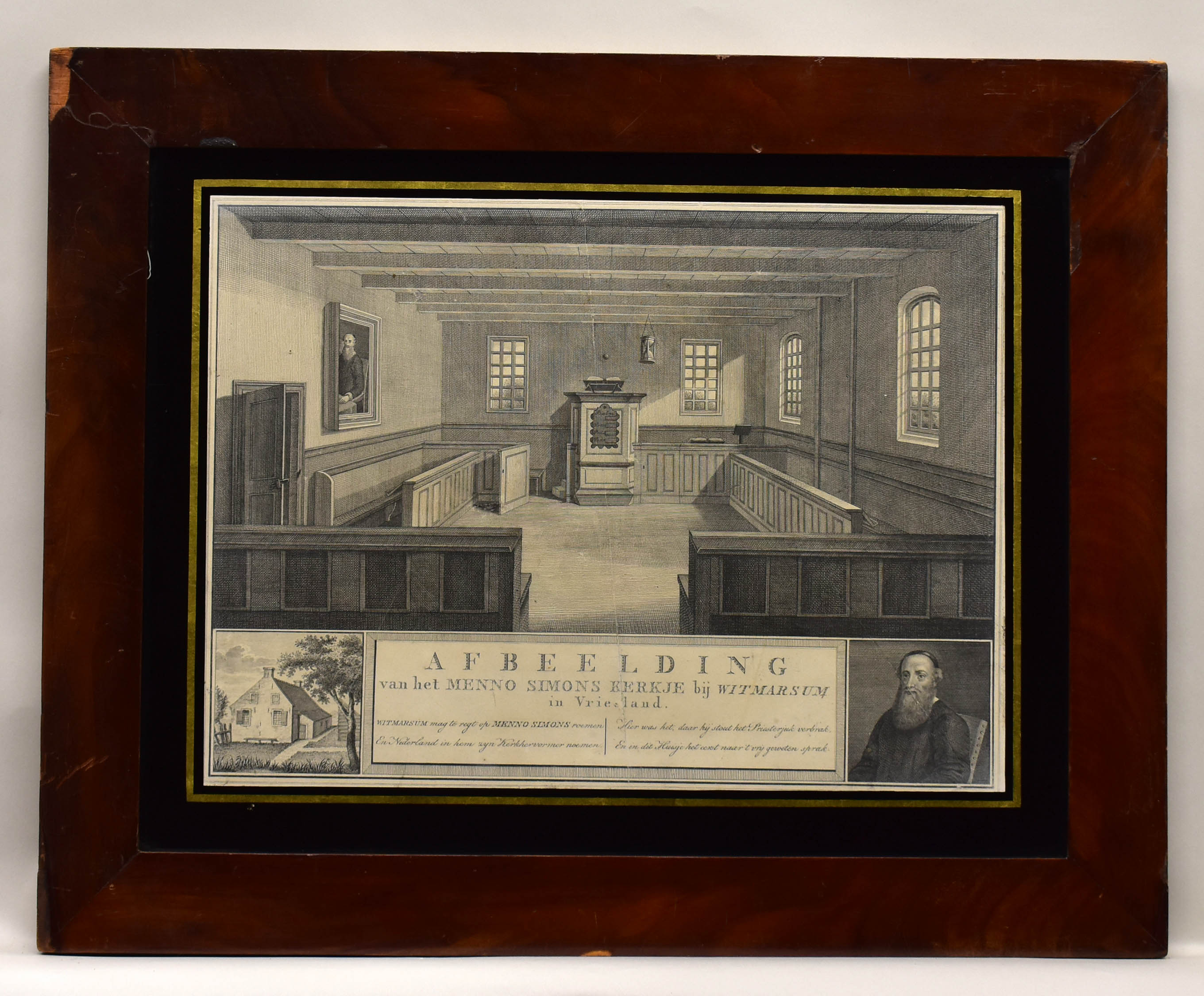 Menno Simons kerkje bij Witmarsum in Friesland, interieur, exterieur en portret van Menno Simons