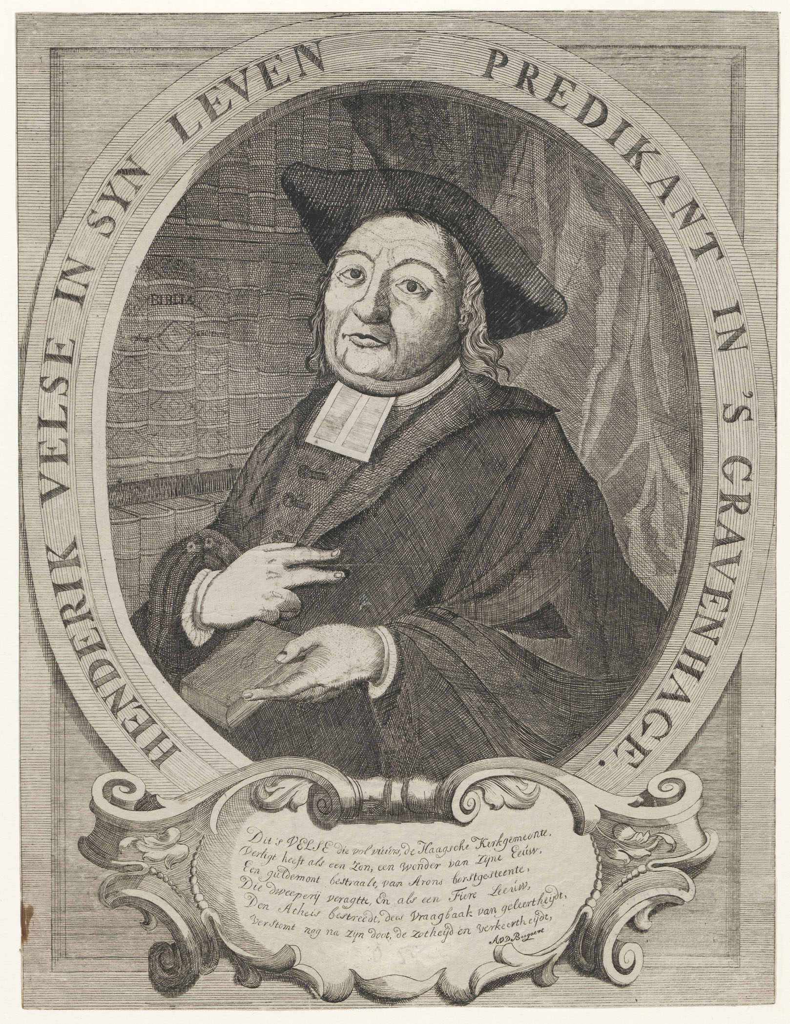 Portret van Hendrik Velse (1683-1744), predikant te Den Haag, met gedicht van A. v.d. Boogaert
