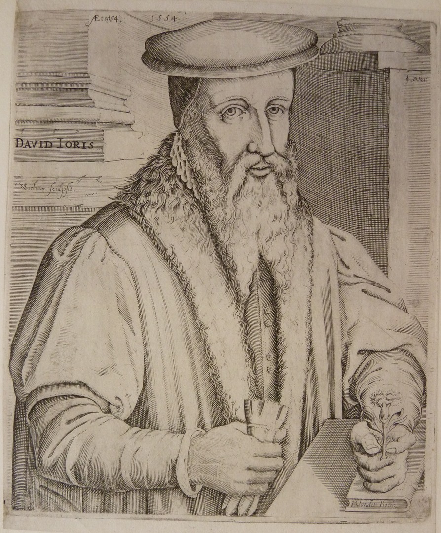 Halffiguur naar rechts, met handschoen in de rechter en bloem in de linkerhand. Linkerhand rustend op een boek met tekst 'wonderboeck'. Van Sichem draagt een met bont gevoerde tabbaard en bonnet. Op zuil aan linkerzijde: 'David Joris' en 'VSichem sculspit' en op rechterzijde 'JCWou'.
