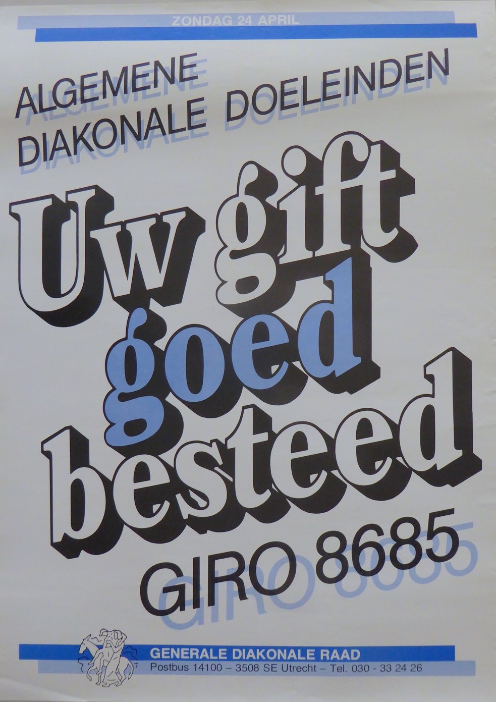 Affiche "Uw gift goed besteed", met "... algemene diakonale doeleinden, giro 8685 ..."
