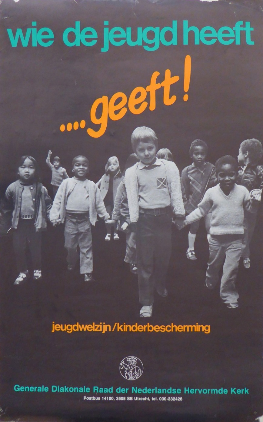 Affiche "wie de jeugd heeft ... geeft!", met "... jeugdwelzijn/kinderbescherming ..."