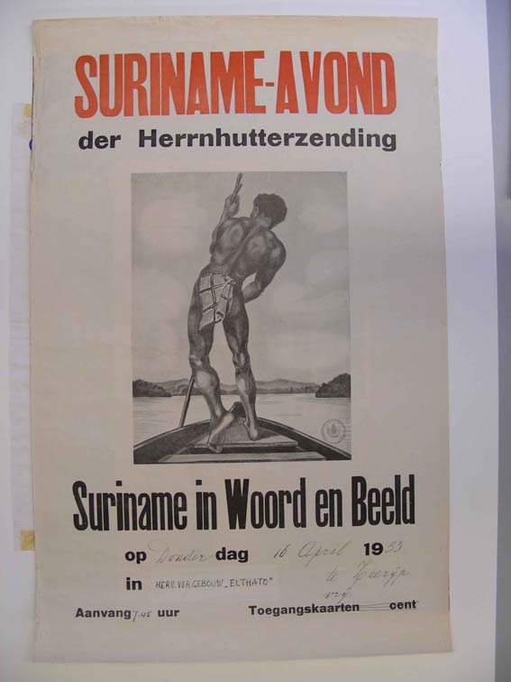 Affiche "Suriname-avond der Herrnhutterzending... op donderdag 16 april 1953...", met Surinaamse man op boot