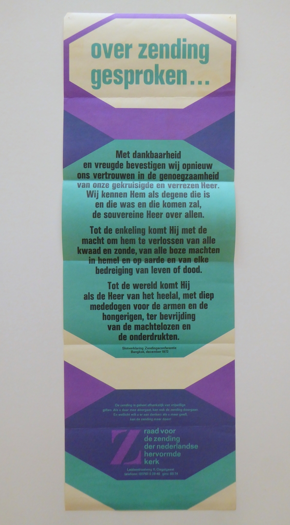 Affiche "over zending gesproken ...", met slotverklaring Zendingsconferentie Bangkok 1972