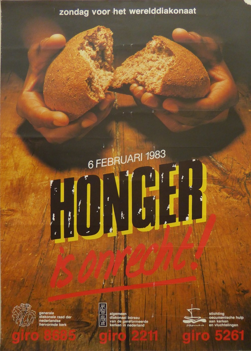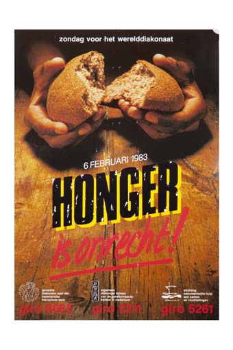 Affiche "Honger is onrecht! Zondag voor het werelddiakonaat ...", met brood dat gebroken wordt