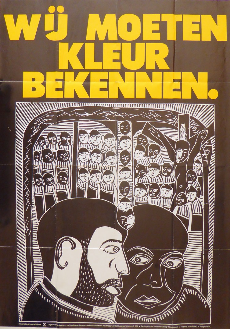 Affiche van Raad voor de Zending der Nederlandse Hervormde Kerk in het kader van de najaarszendingsweek 1973 met "Wij moeten kleur bekennen."