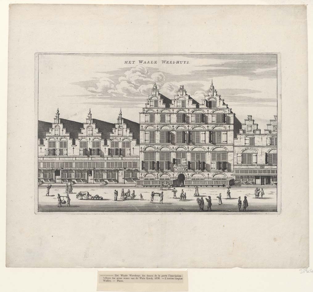 Waalse weeshuis te Amsterdam met "'t Huys der arme weese van de Wale kerk 1630"