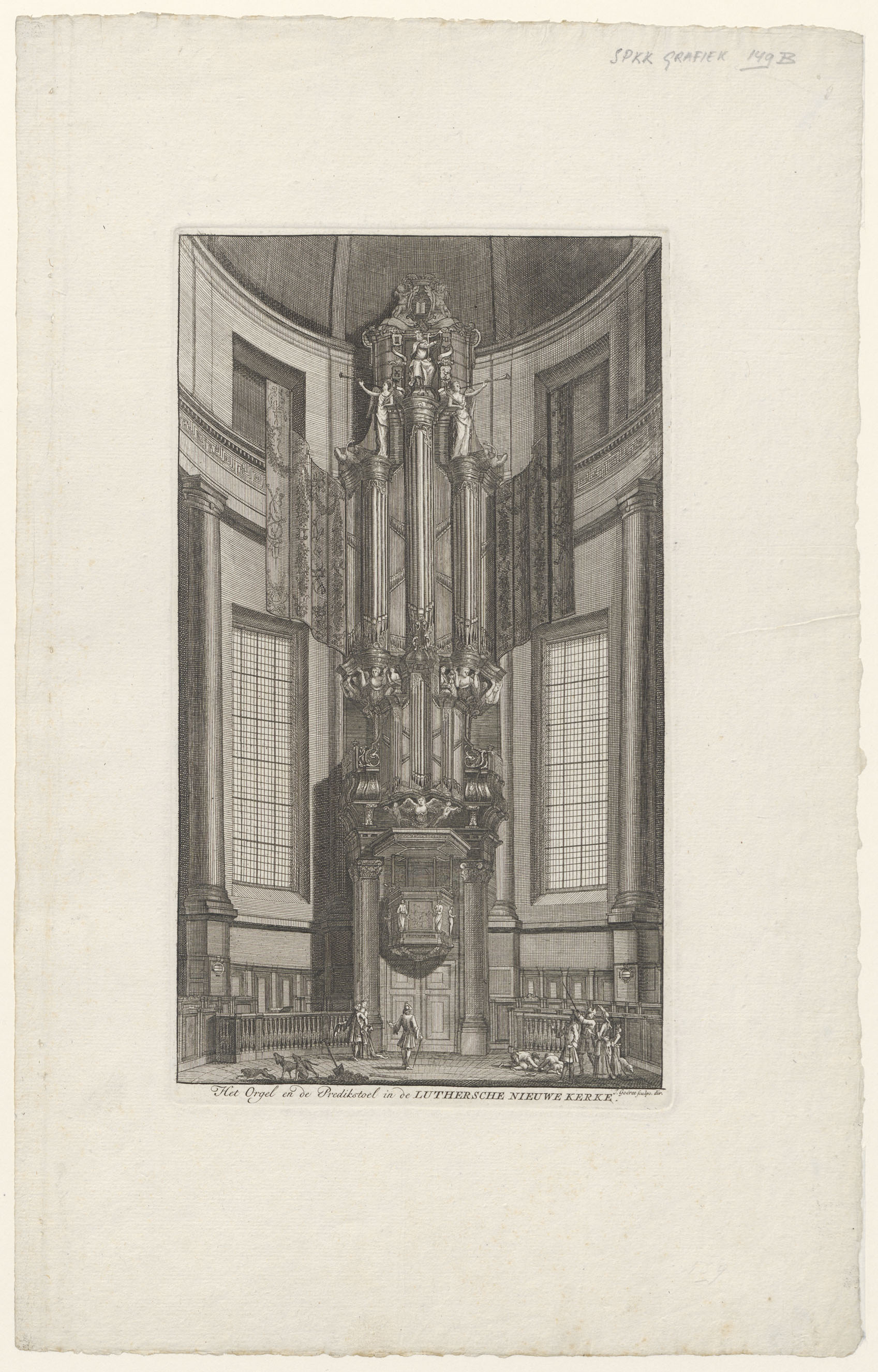 Centraal de kansel met daarboven het orgel met orgelluiken van de Nieuwe (Ronde) Lutherse kerk aan het Singel te Amsterdam. In de kerkruimte enkele wandelaars, kinderen en hondjes. Onder de prent een tekstregel in cursief: 'Het orgel en de Predikstoel in de Lutherse Nieuwe Kerk'.